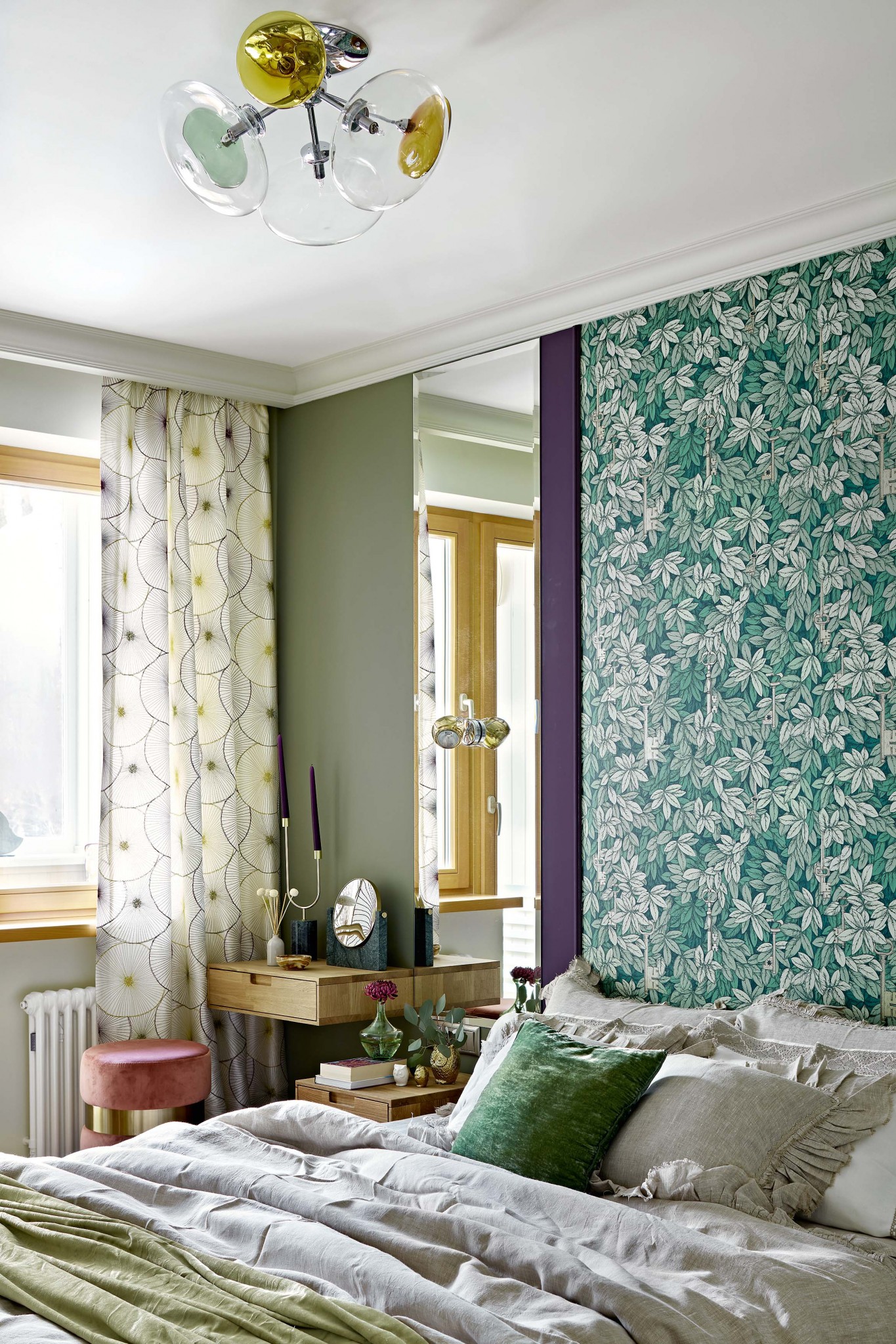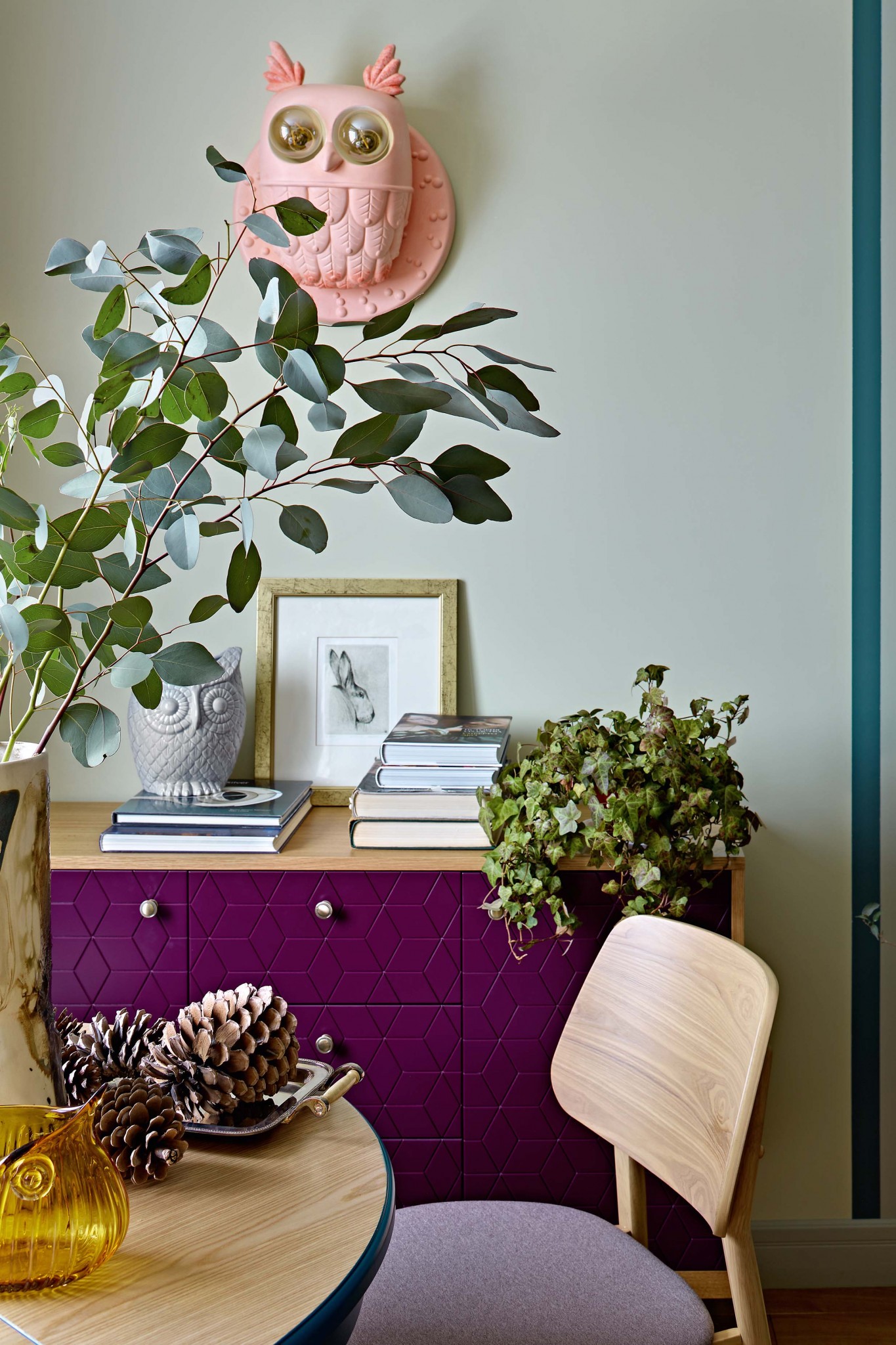 В результате получилась комфортная четырёхкомнатная квартира с гостиной–столовой, двумя спальнями и кабинетом. Водоразделом служит холл, куда попадаем из небольшой прихожей. В нём — четыре двери. Дверь справа ведёт в гостиную–столовую, слева — в кабинет. Две двери прямо по курсу — в спальни. Уже помещение холла задаёт тему волшебного леса, которая по-разному будет проявлять себя в разных помещениях: сдержанно, на нюансах, звучать в зоне гостиной, встречать образами сов в столовой и детской, а в спальне хозяев развернётся в полную силу: обои по дизайну Форназетти в изголовье кровати служат главным декоративным акцентом. В кухне встречаем изящный отголосок этой темы: те же обои, но уже под стеклом в раме, в виде постера — в качестве экрана у плиты. Вообще, здесь много символов, загадок, постмодернистской игры. Это очень личное пространство, удобное прежде всего для его обитателей. Чего стоит, например, стена, окрашенная магнитной краской: прямо на ней рождаются сценарии. Или библиотека, сквозь которую, как в английском замке, есть тайный ход в другое помещение. Как его найти? Совы подскажут.