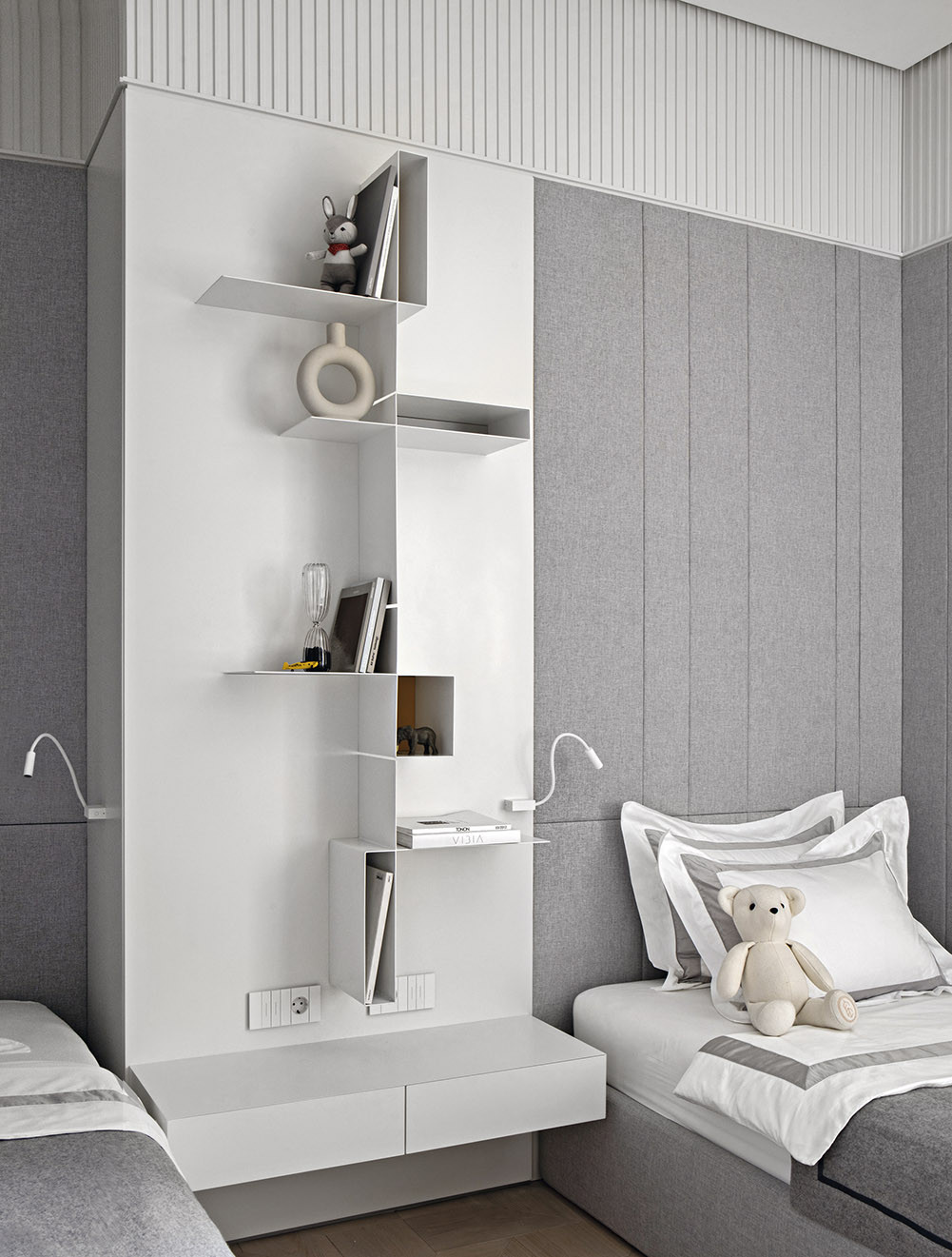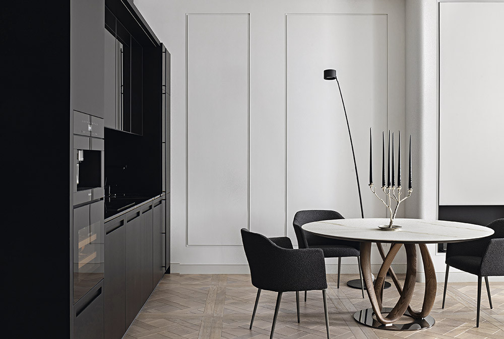 В данном случае интерьер делали для семьи с двумя детьми, что повлияло на планировку: квартира имеет определенное функциональное зонирование и состоит из кухни-гостиной, мастер-зоны с гардеробной и ванной комнатой, детской зоны, входной и постирочной. Из систем «умного дома» по желанию заказчика было реализовано умное управление климатом. Цветовую гамму выбрали монохромную: это и дань лаконизму, и оммаж любимому городу с его неяркой природой. Но черно-белая история при всей своей кажущейся сдержанности может быть яркой и эффектной. Так, из небольшого, полностью черного холла мы попадаем в белую гостиную, наполненную светом и воздухом. Благодаря цветовому контрасту подчеркивается контраст пространств, создается «вау-эффект», эмоциональный заряд. Мастер-спальня также решена в монохромной цветовой палитре, но сочетания подобраны более мягкие: тут использовали серо-бежевые текстильные панели из шерсти в сочетании с бежевыми столярными панелями. Светлый шпон в детской разбавляет и смягчает строгое сочетание серого и белого. Авторы проекта учли и то, как будут проявлять себя в проекте разные фактуры, разные материалы. Так, тактильно приятные текстильные панели в изголовье кроватей создают законченный образ уютных спален. А в парадной по характеру прихожей — другая комбинация материалов: на полу — белый мрамор, на стенах — текстильные обои, шкаф выполнен из кожи черного цвета, на глянцевом лаке в отделке дверей, плинтусов и порталов играют блики.