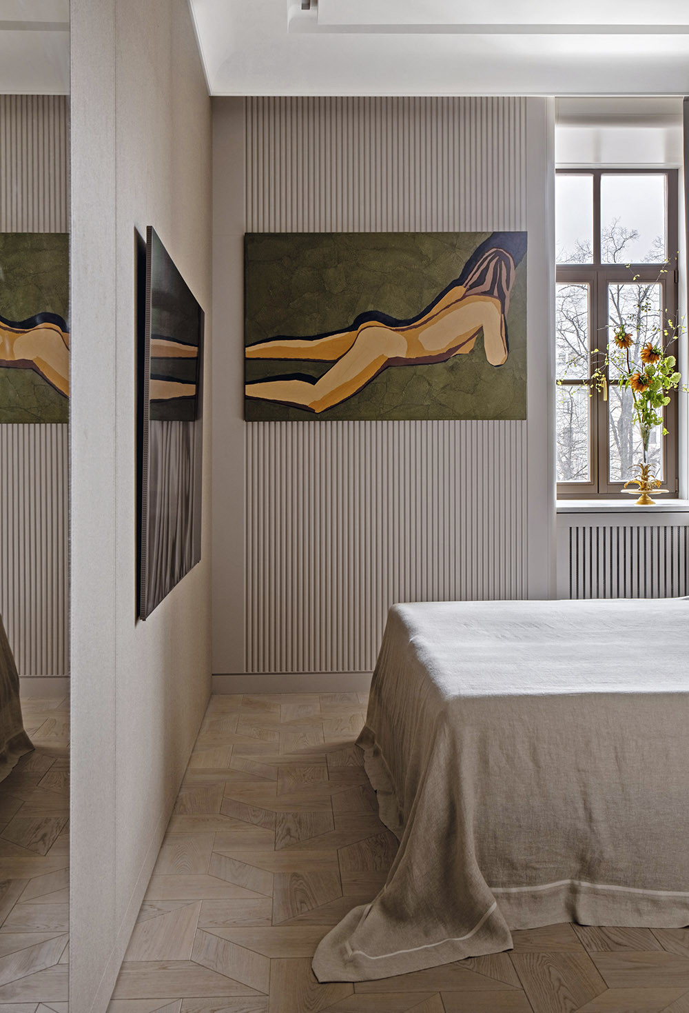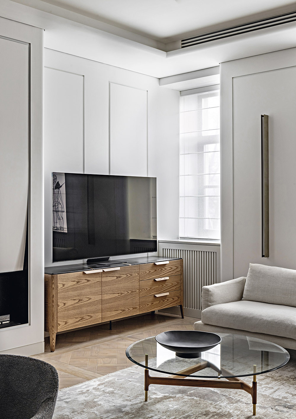 Тандем минимализма и классики создает в интерьере нужный временной контекст, а значит — актуальный и функциональный дизайн». Здесь есть и прямые «цитаты», но их немного. Например, наборный паркет «версальского» плетения: подобный нередко можно было встретить в исторических или дореволюционных санкт-петербургских квартирах.