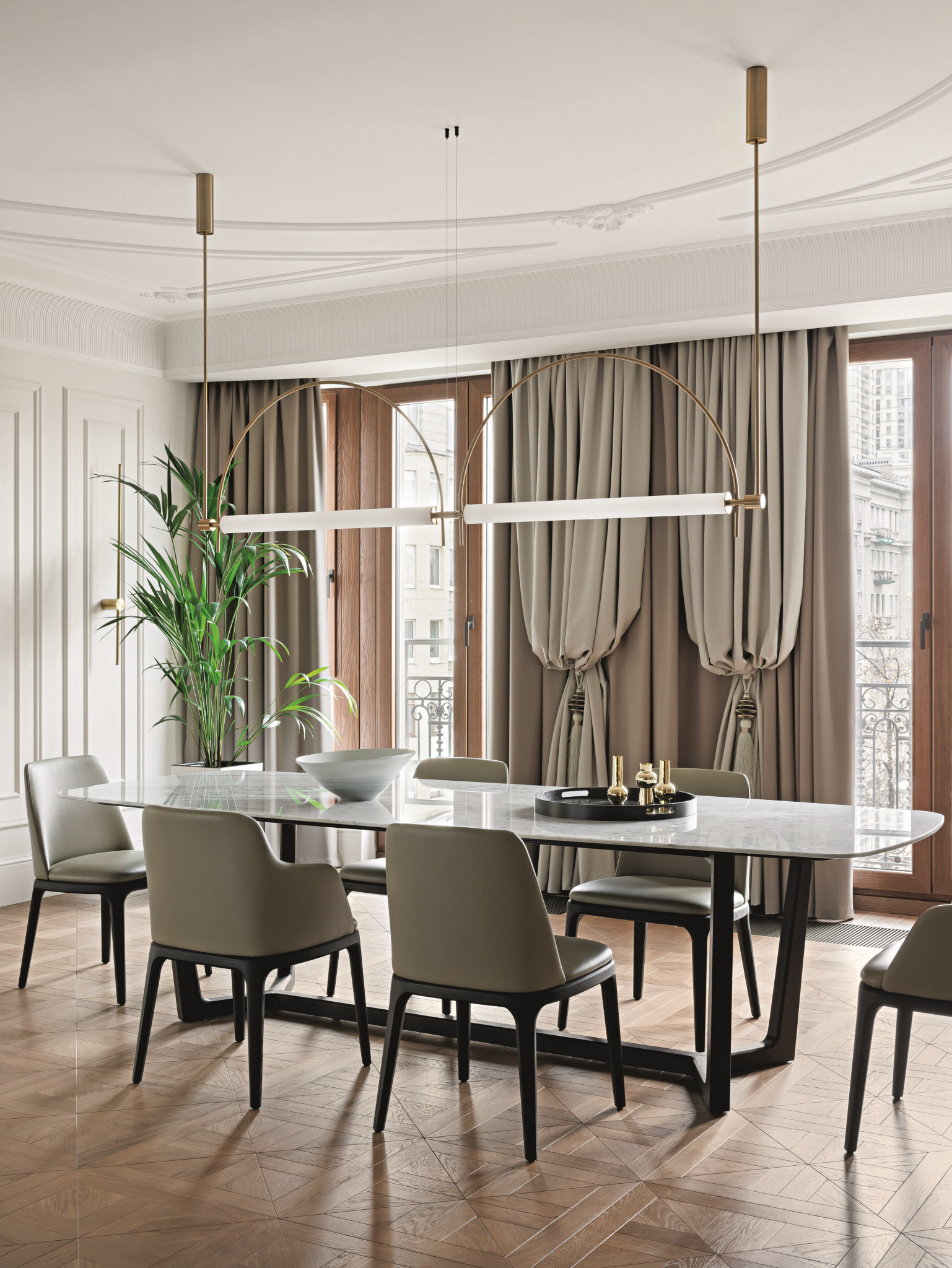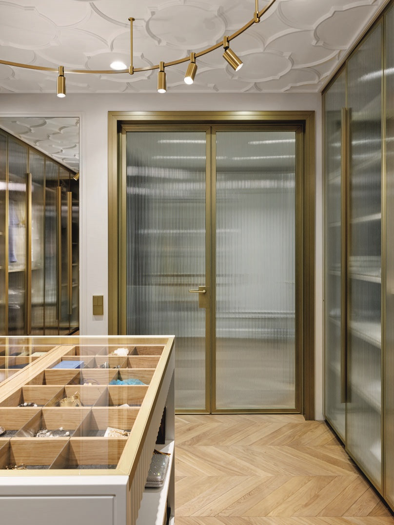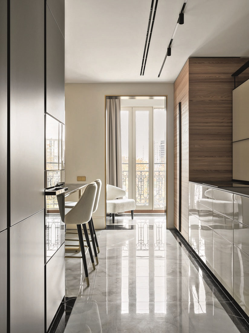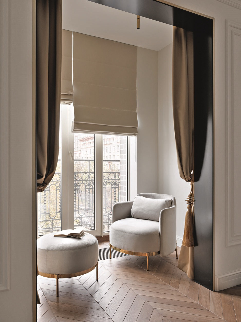 Квартира, над которой работали Елена Куртина и Жанна Тульнова из студии «Шпиль», расположена в центре Санкт-Петербурга, в комплексе, архитектура которого напоминает османовские французские дома. Перед авторами стояла задача привнести в интерьер разнообразие декора и фактур, а также создать пространство, отвечающее потребностям каждого члена семьи. «Заказчики — большая семья с четырьмя детьми разных возрастов. Всем детям хотелось иметь свою комнату с гардеробом и санузлом, — дополняет Елена Куртина. — Это предполагало достаточно большое количество помещений, но нам очень хотелось сохранить ощущение открытого пространства. Поэтому гостиную, кухню и общие холлы мы сделали максимально просторными. Большую роль в достижении нужного ощущения сыграло панорамное остекление в квартире».