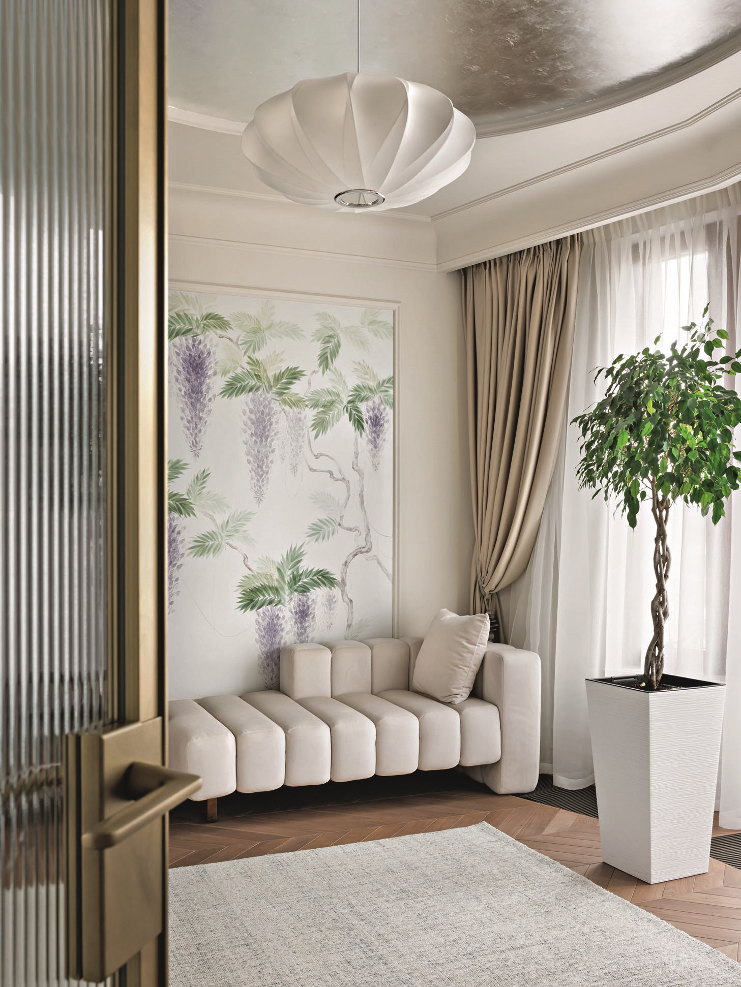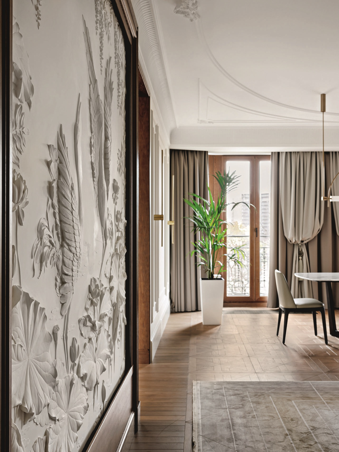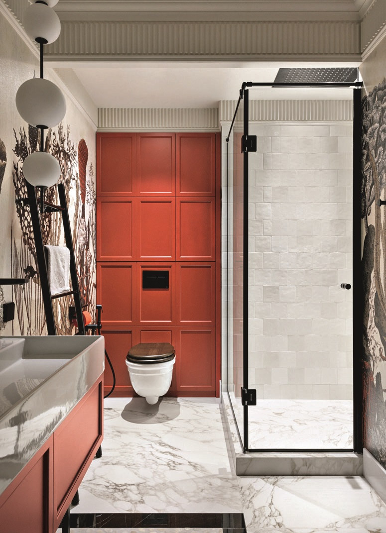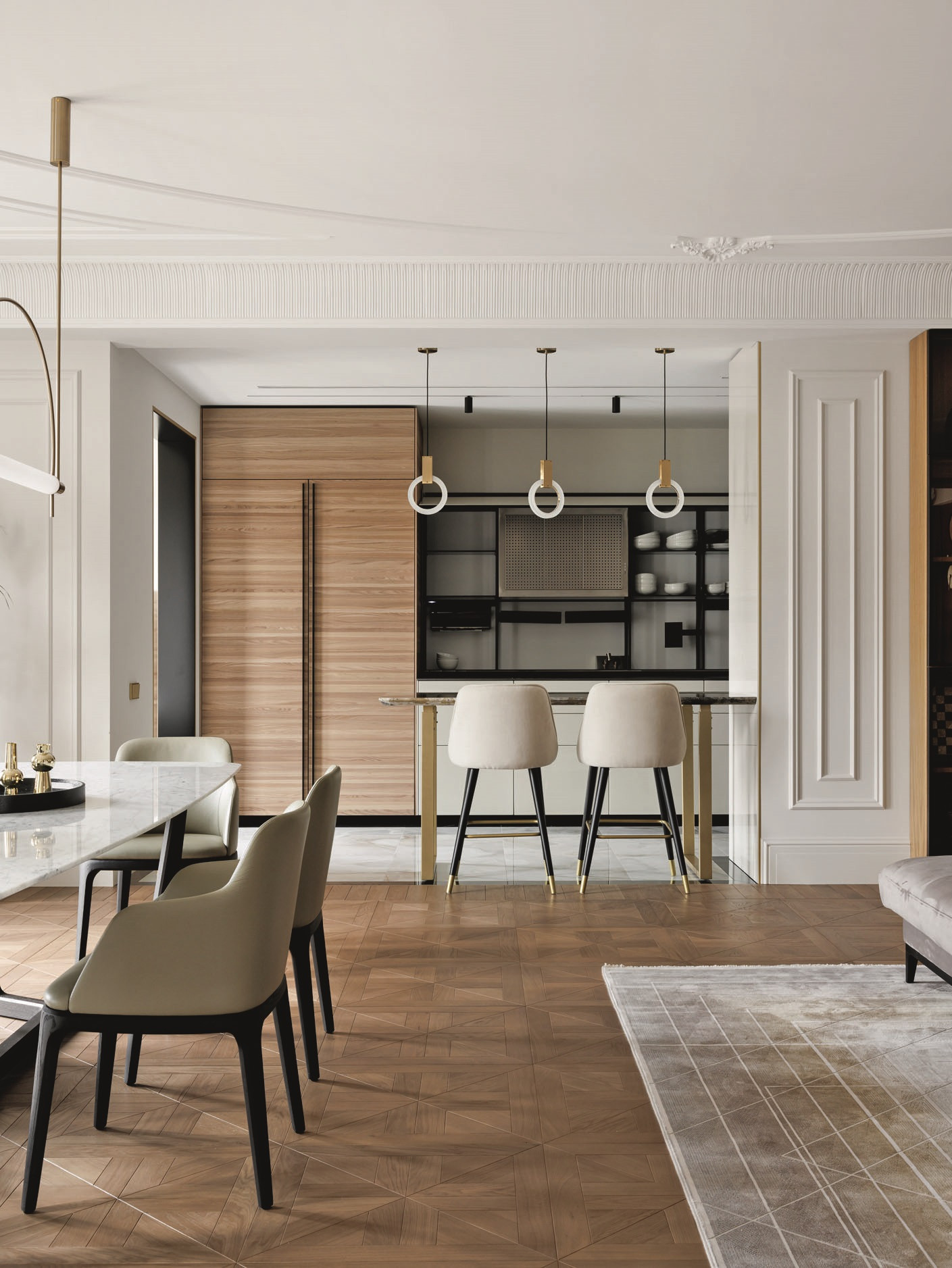 Квартира, над которой работали Елена Куртина и Жанна Тульнова из студии «Шпиль», расположена в центре Санкт-Петербурга, в комплексе, архитектура которого напоминает османовские французские дома. Перед авторами стояла задача привнести в интерьер разнообразие декора и фактур, а также создать пространство, отвечающее потребностям каждого члена семьи. «Заказчики — большая семья с четырьмя детьми разных возрастов. Всем детям хотелось иметь свою комнату с гардеробом и санузлом, — дополняет Елена Куртина. — Это предполагало достаточно большое количество помещений, но нам очень хотелось сохранить ощущение открытого пространства. Поэтому гостиную, кухню и общие холлы мы сделали максимально просторными. Большую роль в достижении нужного ощущения сыграло панорамное остекление в квартире».