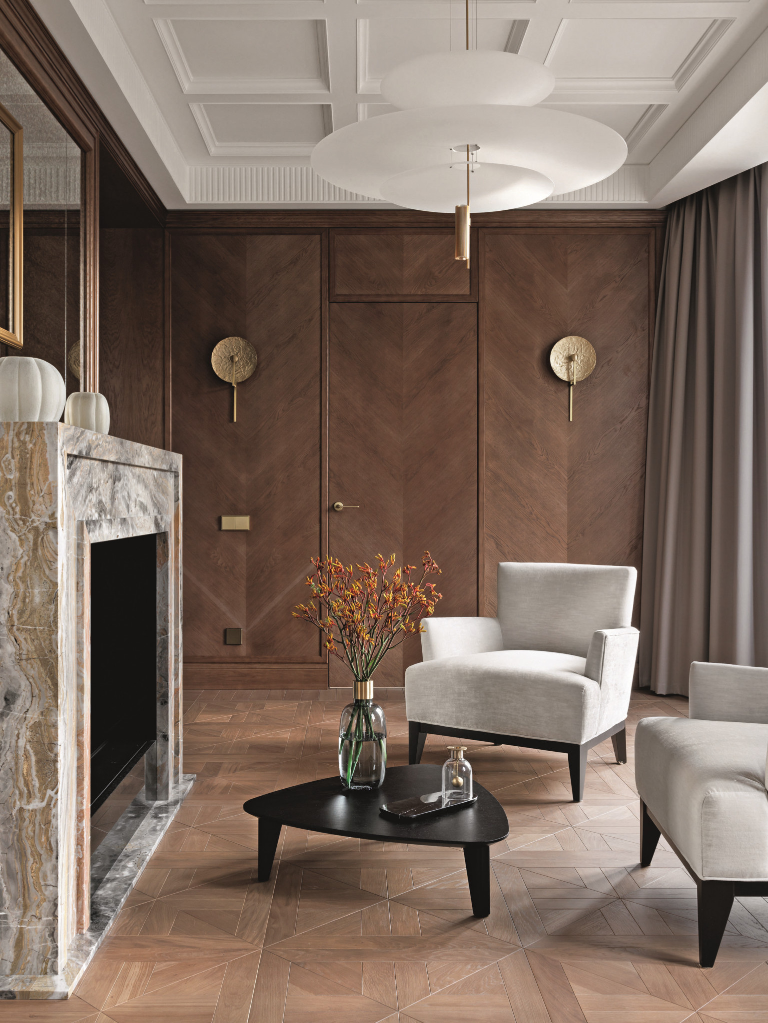 Главным отличием каминной зоны является камерность помещения. Это подчеркивают панели из натурального шпона. Бра на стенах дают мягкое рассеянное освещение. «Когда сидишь около камина, ощущаешь себя как в коконе. Отсюда можно наблюдать за людьми в гостиной, оставаясь при этом в уютном, мягком кресле», — добавляет Жанна.