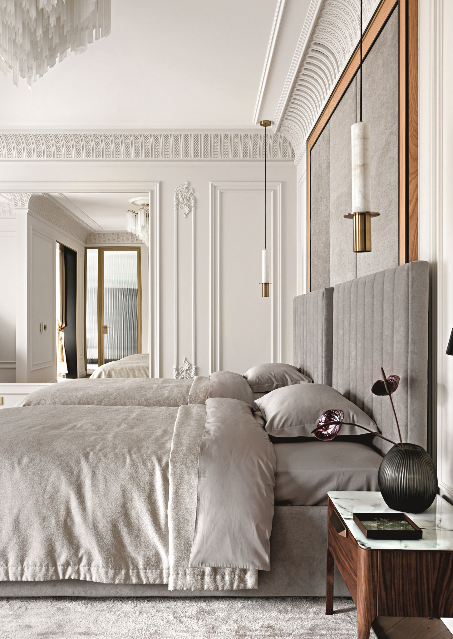 Неоклассика, по мнению авторов проекта, является основой всех интерьеров «вне времени». Этот отзывчивый и гибкий стиль подстраивается практически под любой запрос в интерьере. Он может быть сдержанным и строгим — это хорошо показано в общих пространствах. В детских он непринужденный и соседствует с различными материалами и предметами декора.