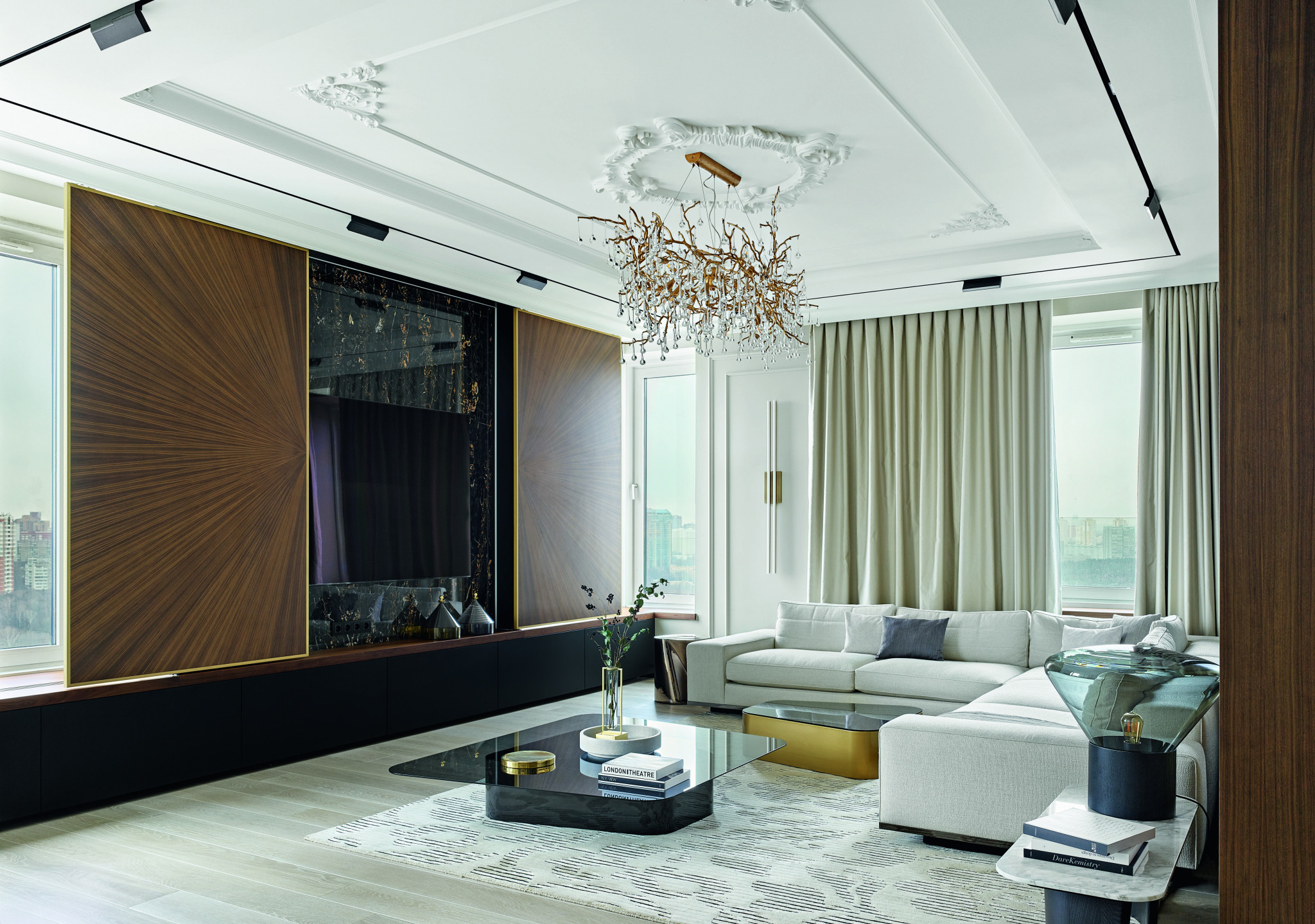 «Возможно ли соединить современный подход к планированию пространства с нарочито классическим декором, а роскошь отделок с лаконичностью форм? Да, если результатом становится яркий и необычный интерьер», — решили авторы этого проекта Дарья Горячева и Алексей Вязьминов