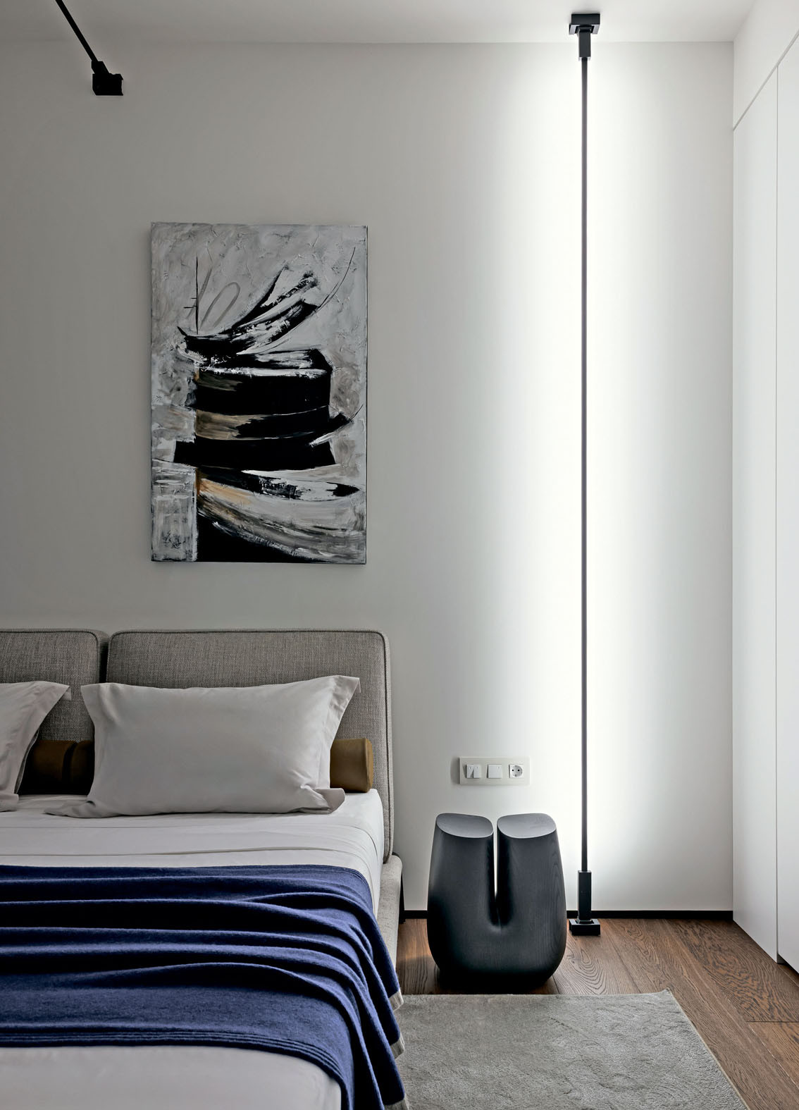 Исходная планировка была переосмыслена с точки зрения эргономики и потребностей домочадцев. Пространство гостиной объединили с кухней, дверные проемы расширили, а за счет площади прихожей организовали удобную хозяйственную комнату. Разбросанные по квартире системы хранения стали более продуманными и сосредоточенными. В основе цветовой гаммы — светлые монохромные стены, создающие ощущение простора и легкости. Им противопоставлены глубокие оттенки, навеянные каштанами за окном. Этот природный акцент проявился в лаконичных панелях из шпонированного американского ореха. Напольное покрытие из инженерной доски обожженного дуба и керамогранит с текстурой травертина в санузлах добавили графичности и тактильной теплоты. Элегантные двери Rimadesio с полотнами из матового стекла подчеркивают чистоту линий. Кухонная мебель, включающая остров, решена в строгой темной гамме. Все оконные проемы также подчеркнуты панелями из темного дуба. Этот насыщенный оттенок объединяет пространства, подчеркивая декор и детали во всей квартире, такие как барная стойка от Poliform из черного вяза на кухне. «Мы долго определялись с расположением кухни, пока не придумали вынести два высоких пенала на границу с гостиной, объединив их материалом с отделкой ТВ-панели. Это создало цельный архитектурный блок и четко обозначило переход между зонами», — дополняет Татьяна. Особую роль играет освещение. Подвесной светильник Moon от Davide Groppi парит над обеденным столом, а световые линии Infinito Endless, расположенные горизонтально и вертикально в гостиной, спальне и санузле, создают эффект бесконечности и работают как самостоятельные арт-объекты. Этот интерьер — индивидуальная история, где монохромная основа и строгость минимализма смягчены теплом натуральных материалов. Пространство, где каждая деталь создает атмосферу спокойной, вневременной роскоши.