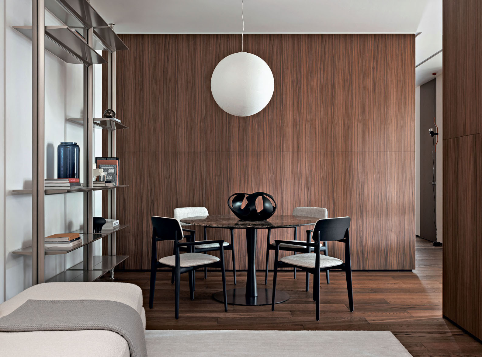 Шпон ореха, инженерная доска, керамогранит под травертин и матовое стекло — осознанный выбор в пользу натуральной и безопасной среды для жизни