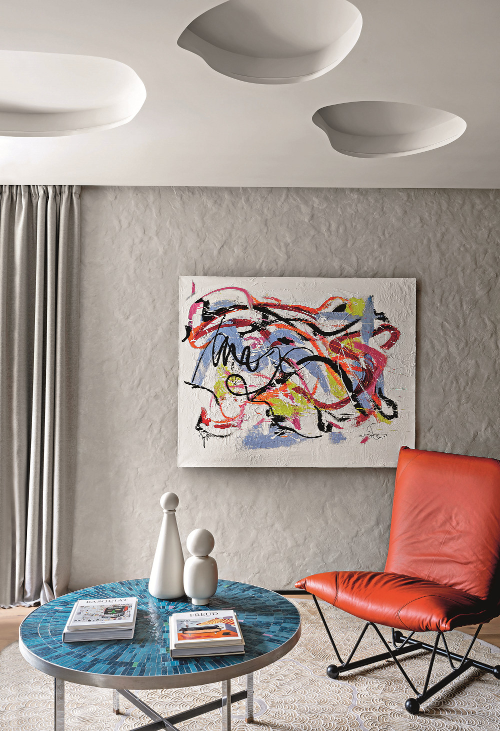 игривость и доверие, ключевое для меня условие». Главным пожеланием было наличие систем хранения для одежды, отдельные шкафы для обуви мужа и инвентаря для активного отдыха. Необходимо было создать и большую гостиную, совмещённую с кухней чёрного цвета (по версии мужа) или светлого (по желанию жены), а также полноценную барную зону с холодильником для вина. Ещё одним обязательным условием стал просторный душ в ванной комнате при спальне. Выслушав заказчиков, Светлана Дикушина начала с решения куда более насущных вопросов, которые диктовало непростое пространство. Нужно было продумать современный образ интерьера на достаточно большой площади, но при критически низких потолках в 2,6 и 2,4 метра. «Мне захотелось изобразить интерьер строгим, но лёгким и парящим, устремлённым вверх, а главную интригу создать в сочетании форм и текстур. При проектировании я добавила зеркальные поверхности и ритм вертикальных линий за счёт порталов межкомнатных дверей и контрастных профилей на фасадах шкафов. Высокие изголовья в спальнях также скорректировали восприятие пространства и сделали потолки визуально выше, — комментирует автор проекта. — Пришлось придумывать и деликатное оформление больших окон, которые так нравились заказчикам: корпуса жилого комплекса расположены близко друг к другу и без драпировок нельзя было создать чувство приватности». Гармоничным решением этих задач стало смешение современного стиля с японской эстетикой ваби–саби, умением видеть мимолётную красоту в простых, несовершенных, но подлинных вещах. Это позволило сохранить принципы функциональности, но наполнить интерьер оригинальными авторскими предметами. А вот от арт–объектов и винтажных вещей, которые очень любит использовать Светлана Дикушина, пришлось отказаться.