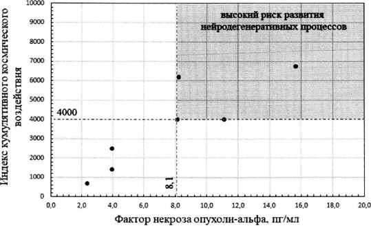 Разработанный учеными СПбГУ метод предполагает, что сначала рассчитывают ИККВ и анализируют уровень ФНО-α. Затем с помощью специального коэффициента проверяют, есть ли между ними корреляция (взаимозависимость). Если она есть, то строят график и на нем располагают точку, координатами для которой служат уровень ИККВ (вертикальная ось) и значение ФНО-α (горизонтальная ось). Риск развития нейродегенеративных процессов будет считаться высоким, если точка попадет в правый верхний квадрат графика, то есть при значении ИККВ больше 4000, а концентрации ФНО-α — выше 8,1 пг/мл.