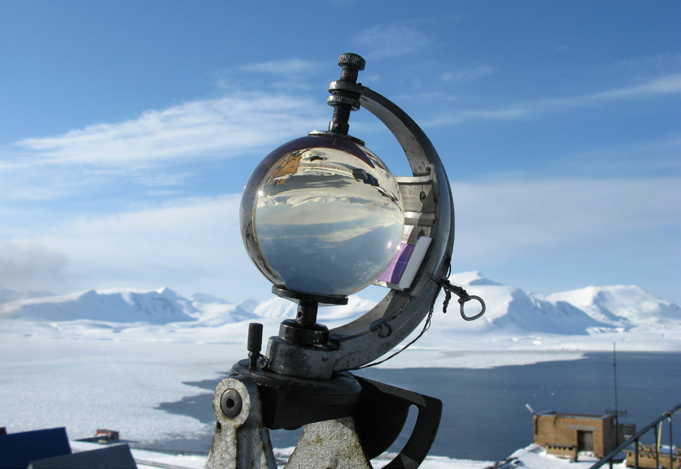 Самый популярный прибор в метеорологии — гелиограф. Регистрирует продолжительность солнечного сияния. Установлен на крыше лабораторного корпуса Российского научного центра на Шпицбергене. Предоставлено Б. В. Ивановым