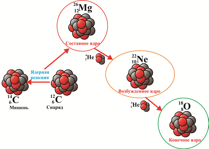 Вот еще интересная космическая задачка. Современные исследования, связанные с изучением вещества внеземного происхождения, говорят, что в некоторых метеоритах, которые прошили простор Вселенной и упали к нам, наблюдается повышенное содержание изотопов неона: 21Ne и 22Ne. Тогда как у нас на Земле (да и во Вселенной) преобладает изотоп неона с массой 20. Физики СПбГУ подробно изучили ядерную реакцию с образованием изотопа 22Ne. Они взяли очень редкую радиоактивную мишень углерода-14, которая обладает избытком нейтронов, и бомбардировали ее другим, обычным углеродом — 12С. В ходе слияния этих ядер физики получили возбужденное ядро 22Ne. Но прежде чем изучать такое ядро всесторонне, они на ранних стадиях этой реакции (см. рисунок) смогли так сильно закрутить образующуюся ядерную систему, что система на мгновение стала похожа на ядерную молекулу. Еще при анализе этой реакции (см. рисунок) им удалось идентифицировать распад такой ядерной системы в экзотический канал, в котором образуется довольно редкое нейтронно-избыточное ядро 6Не. Обычный гелий, которого почти 99,999998 % в природе, — это 4Не, а 6Не в природе просто нет, поскольку он живет всего 0,8 секунды.