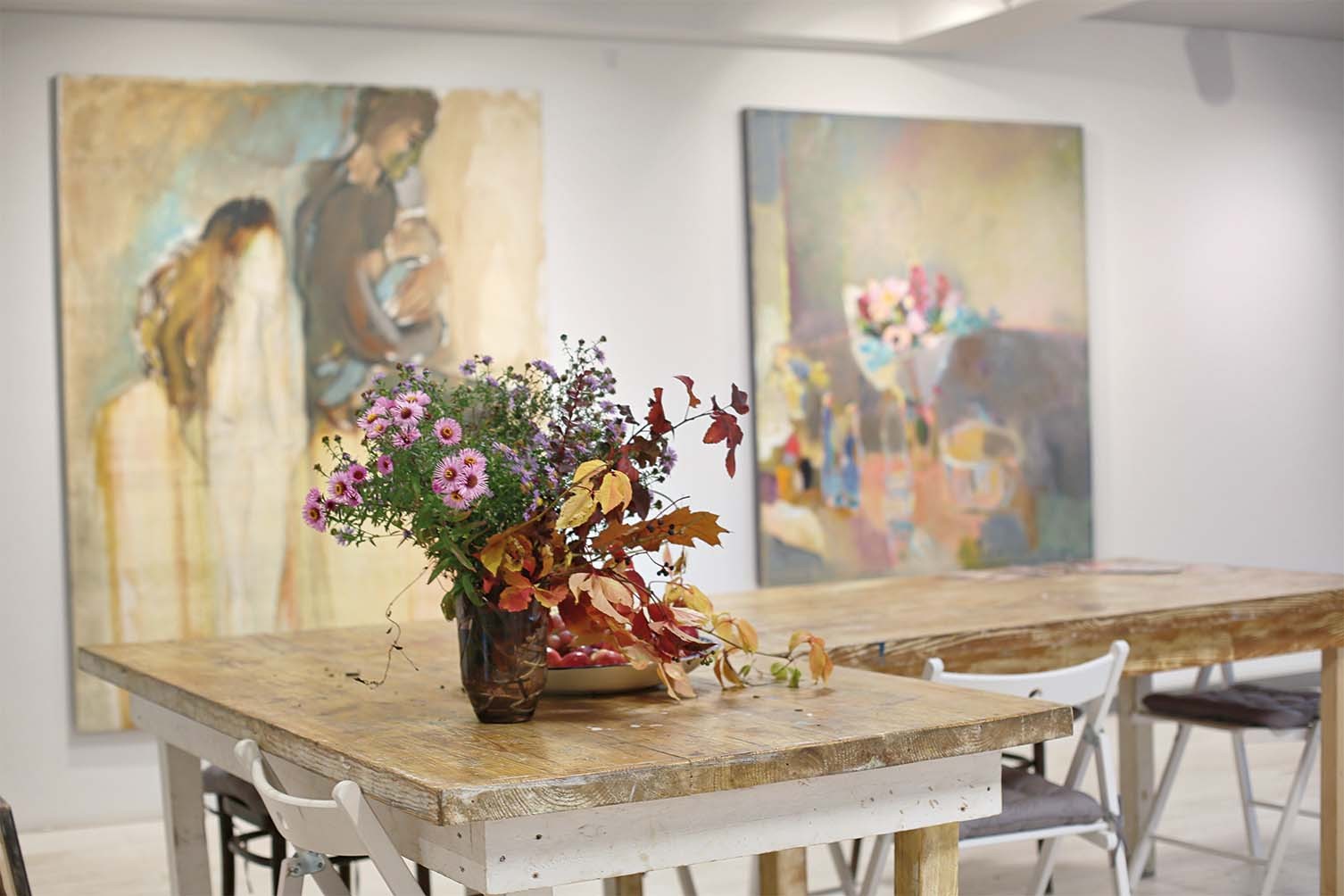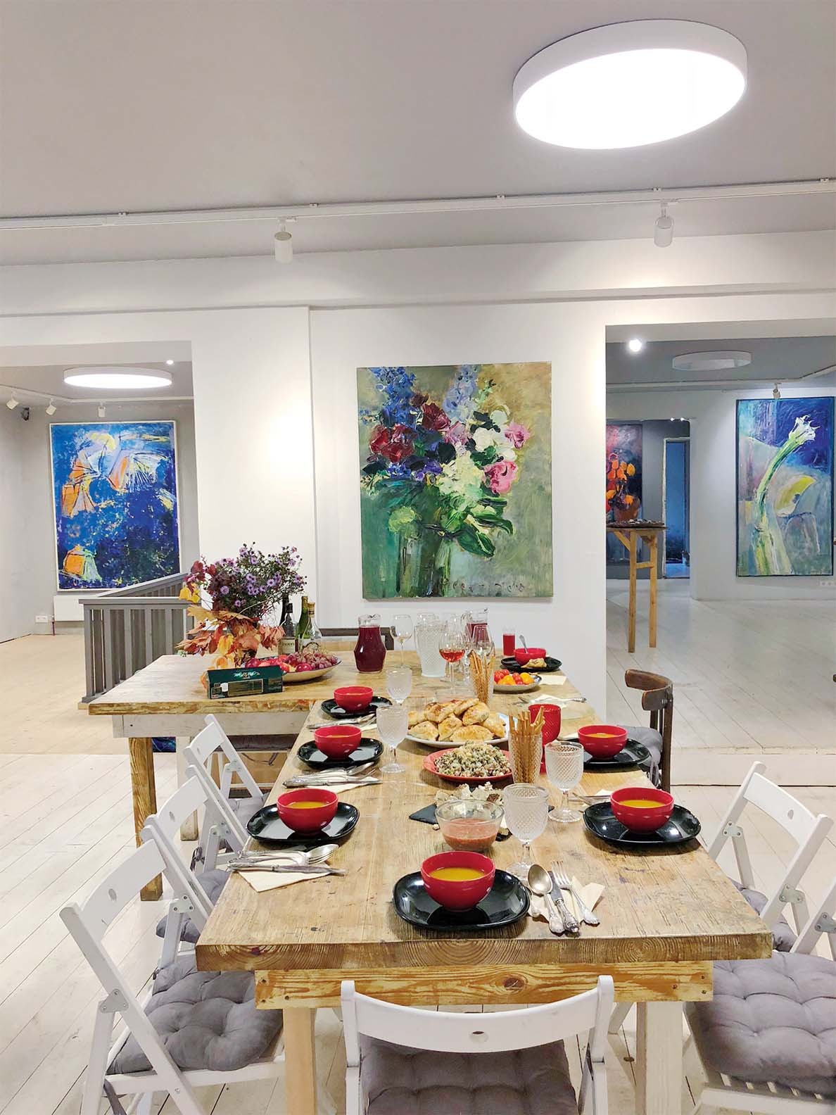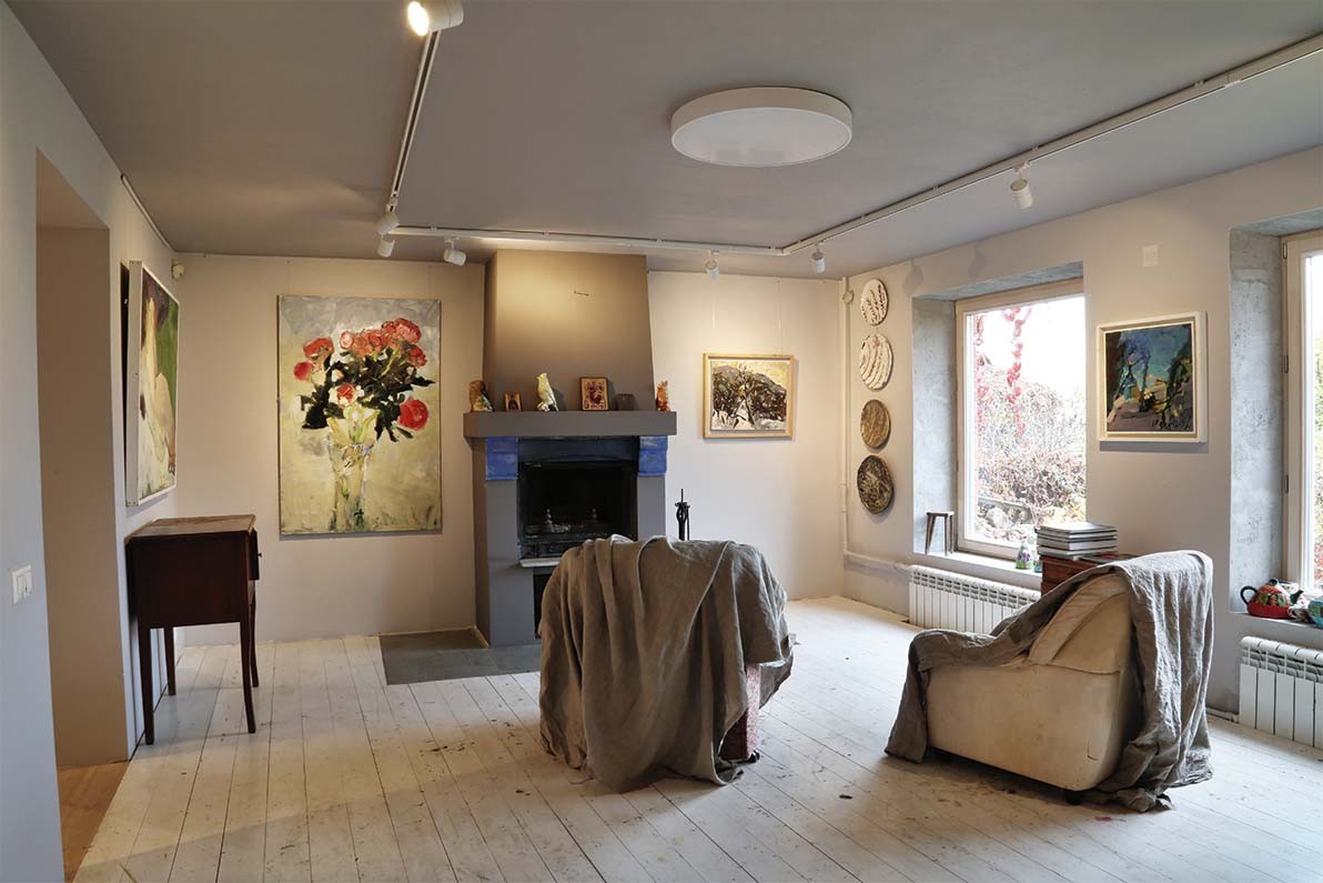 Что может быть естественнее для художника, чем домашняя галерея? Особенно если художник — женщина. Тогда мир художественный соединяется с миром житейским. Картины наблюдают жизнь семьи, дети растут среди вибрирующего цвета трехметровых полотен с огромными цветами, лепестки которых осыпаются, но никогда не осыпятся. В мастерской пахнет красками, а с кухни — свежими пирогами. Гости рассматривают работы, сидя за просторным столом, а потом собираются вокруг него на вкуснейший обед, приготовленный хозяйкой: домашний козий сыр, запеченное с травами мясо, пряный тыквенный суп, узбекская самса и французское «розе». Это мир Аси Феоктистовой. Она родилась в Нижнем Новгороде, закончила в Москве Художественное училище 1905 года по специальности «театральный художник», последние 14 лет живет в Звенигороде, в большом доме, обращенном к Саввино-Сторожевскому монастырю.