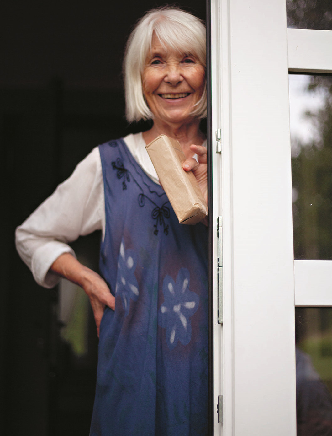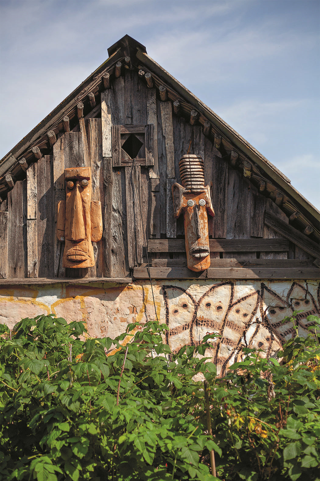 Галина ждет нас возле яблони, за ветви которой зацеплена леска, и на ней качается тоненькая занавеска. Ныряем под нее — бахрома легонько касается лба, будто рука. Чудеса начинаются. Вот стоит белый мазаный дом, здесь и жили хозяева. Глазастый дом, с характером. Рядом бывший хлев — домик поменьше, тоже расписанный Анатолием. Архаичные сюжеты снаружи, лопаты, грабли, ведра и другой садовый скарб — внутри. К египетским фигурам, пишущим что-то на папирусе, прислоняются доверчивые флоксы. К африканским маскам тянется малина. Жук, похожий на синего скарабея, застыл рядом с аккуратными капустными грядками.