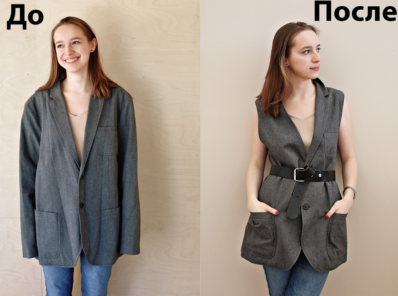 Дизайнер Ольга Сингх показала, как за час превратить старый мужской пиджак в женский жилет. Наш арт-директор Соня Каем принесла пиджак мужа и заодно выступила в роли модели.