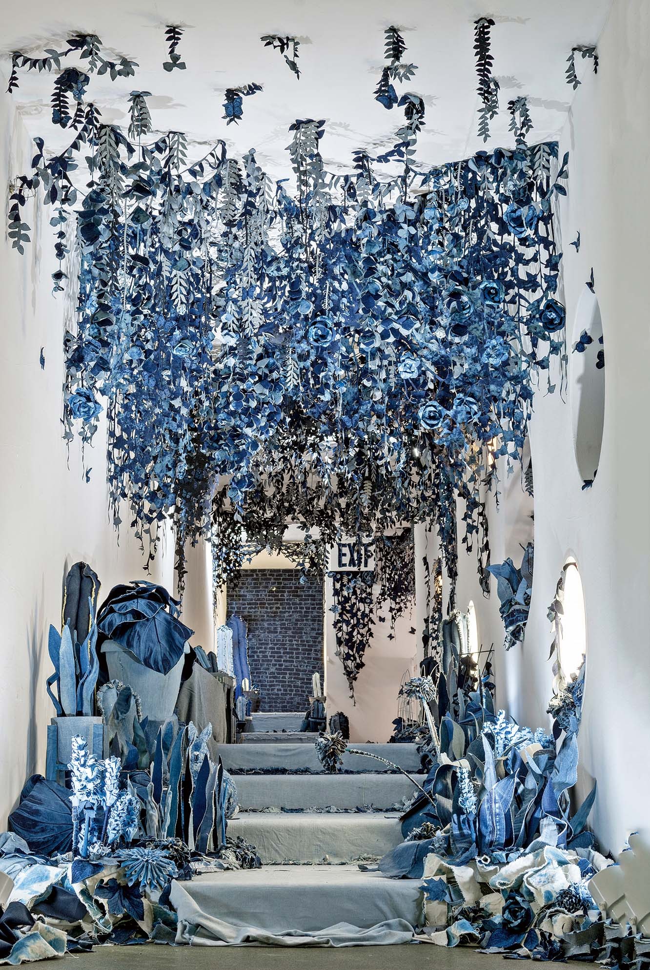 Попадая в музей, дети и родители идут через джинсовые джунгли: мимо кустов роз и хризантем, глициний и кактусов. С потолка свисают виногратные лозы и тропические растения. Джинсовая ткань — неожиданный материал для воссоздания природы, но он понятен всем: мы все занашиваем любимые джинсы. Для Яна важно, чтобы ребенок рвал