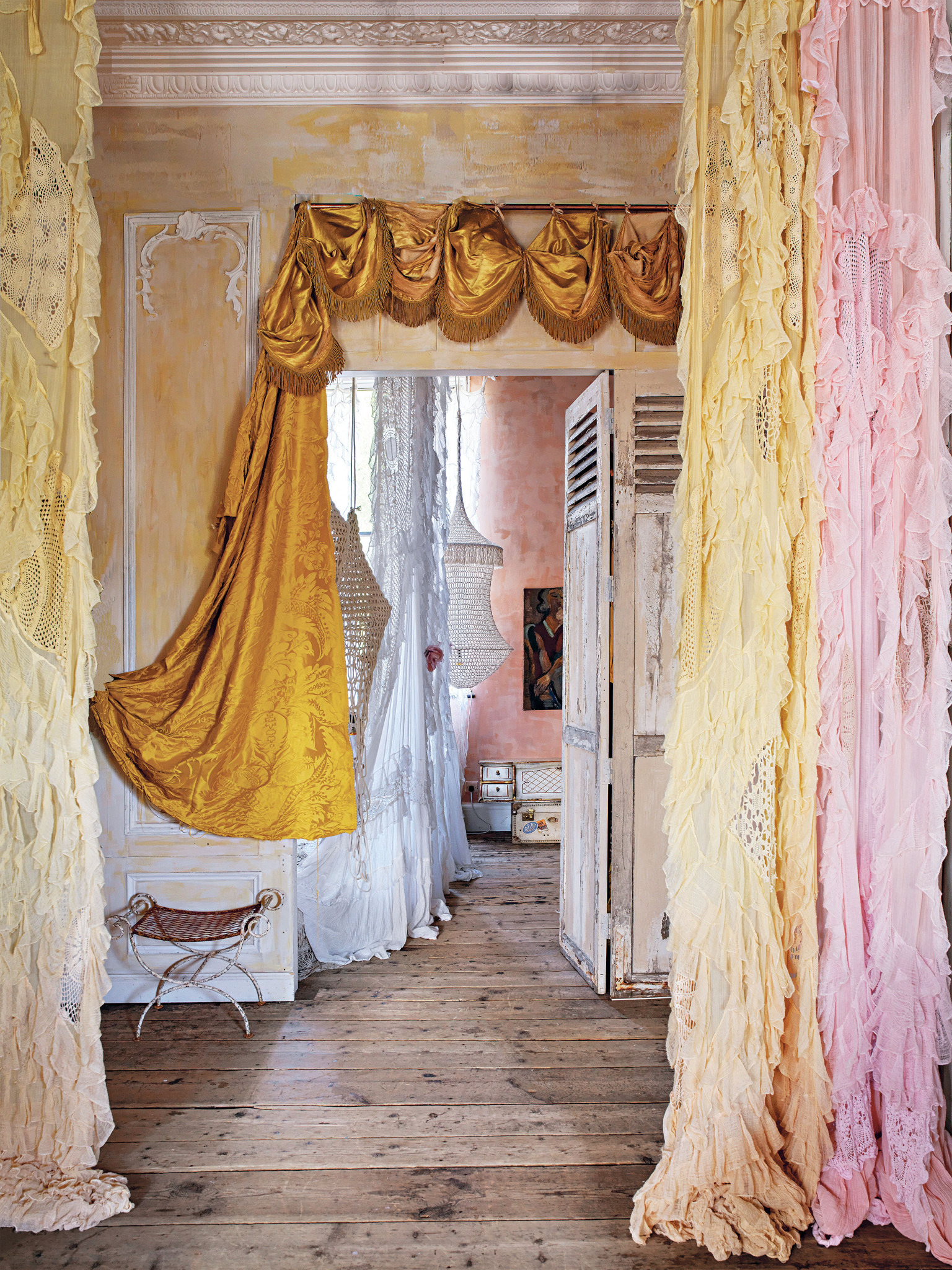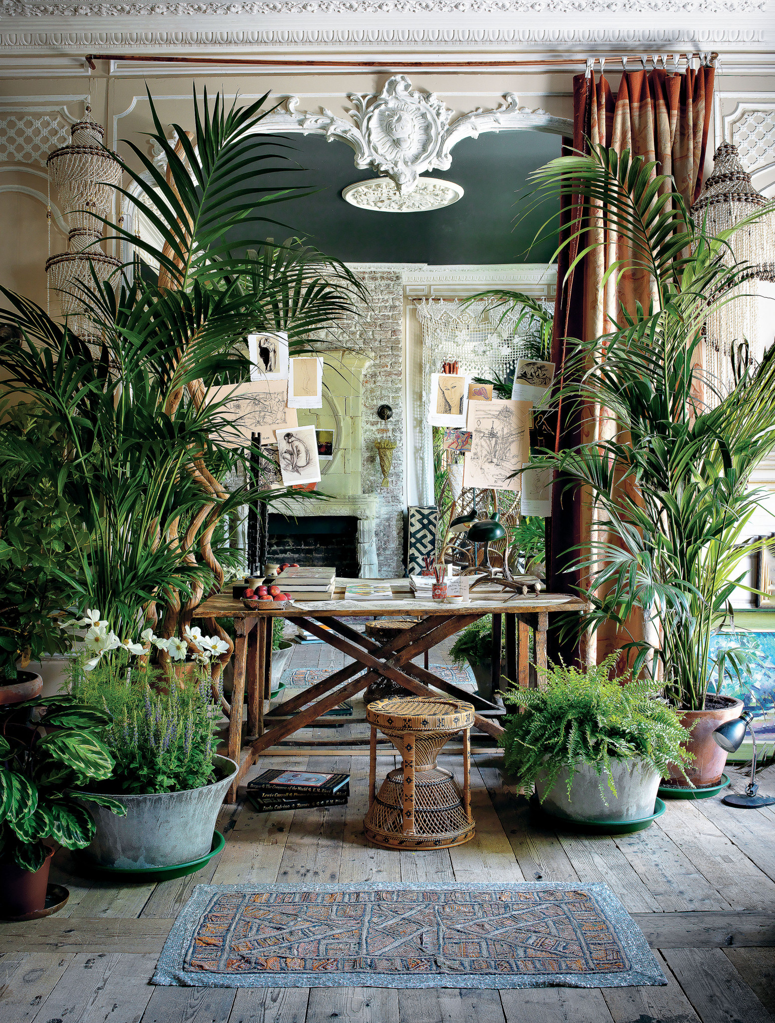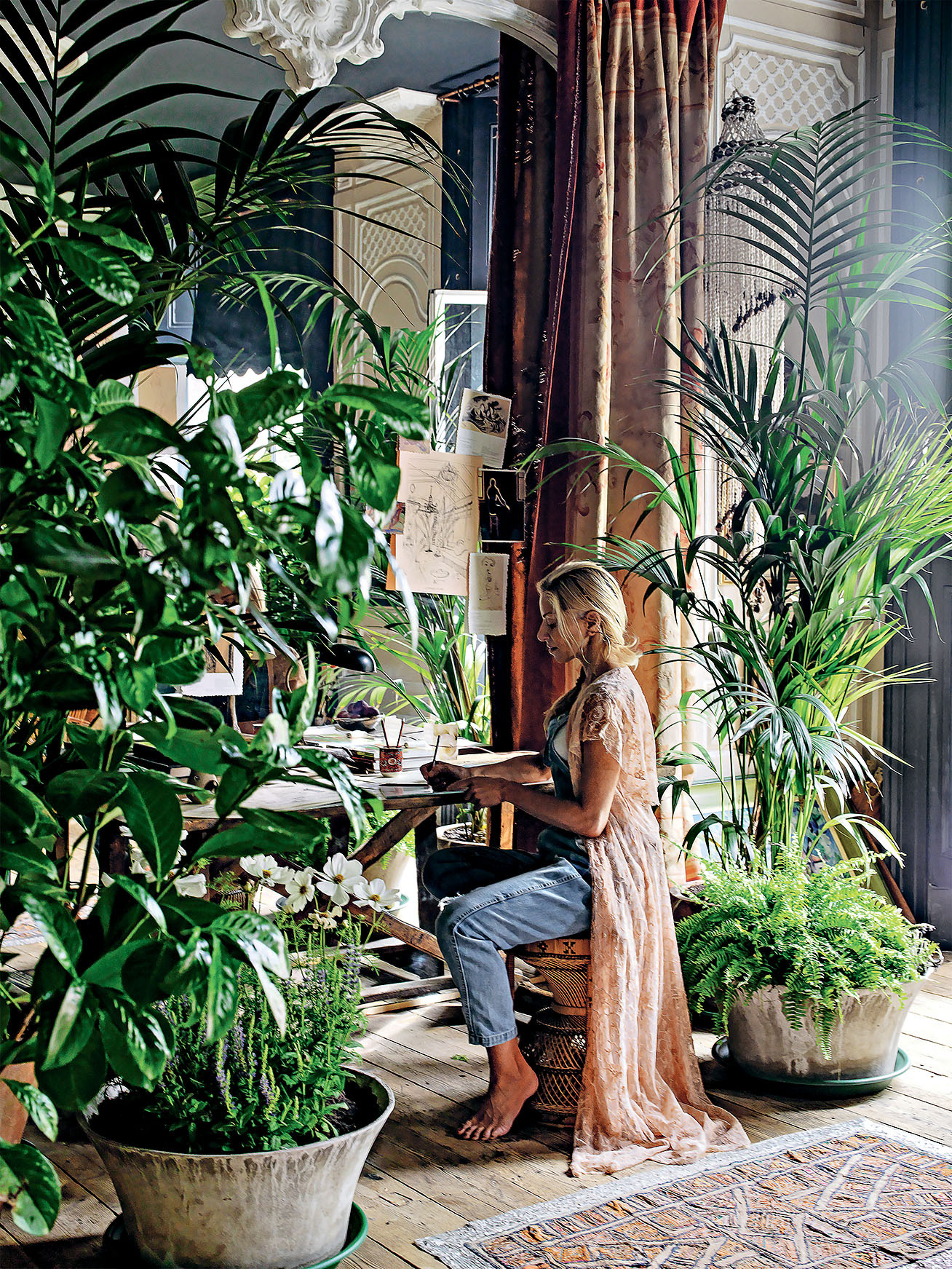У моего папы была своя художественная галерея. В эту квартиру я переехала вскоре после его похорон. Позвала друзей, попросила принести каждого по зеленому растению в горшке в память о нем. Так появился сад в стенах дома — первый и мой любимый период в жизни этой квартиры. Потом она переродилась в венецианское палаццо, еще чуть позже — в деревенский дом на берегу моря… Одно остается неизменным — здесь повсюду лежат книги из библиотеки отца, мое главное наследство.