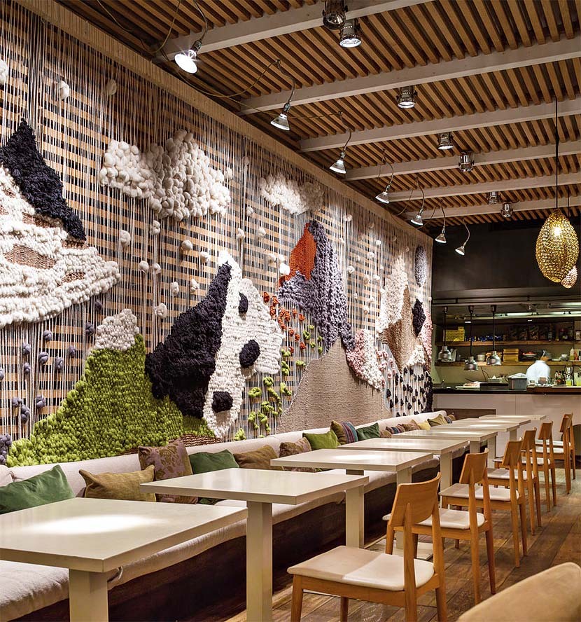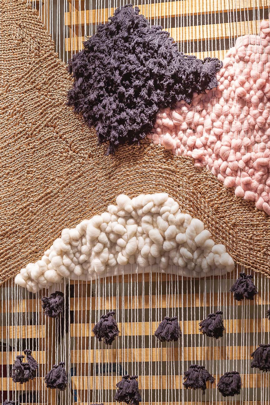 Мариадела Араухо живет в Барселоне, а родилась в Венесуэлле – стране, где традиционно много ткут из шерсти. Это объясняет ее выбор художественного языка и материала — Мариадела ткет целые многометровые ландшафты-панно, инсталляции, одежду. Сейчас многие увлекаются ткачеством, но немногие делают такие масштабные объекты. Например, одна из ее работ украшает целую стену в барселонском кафе.