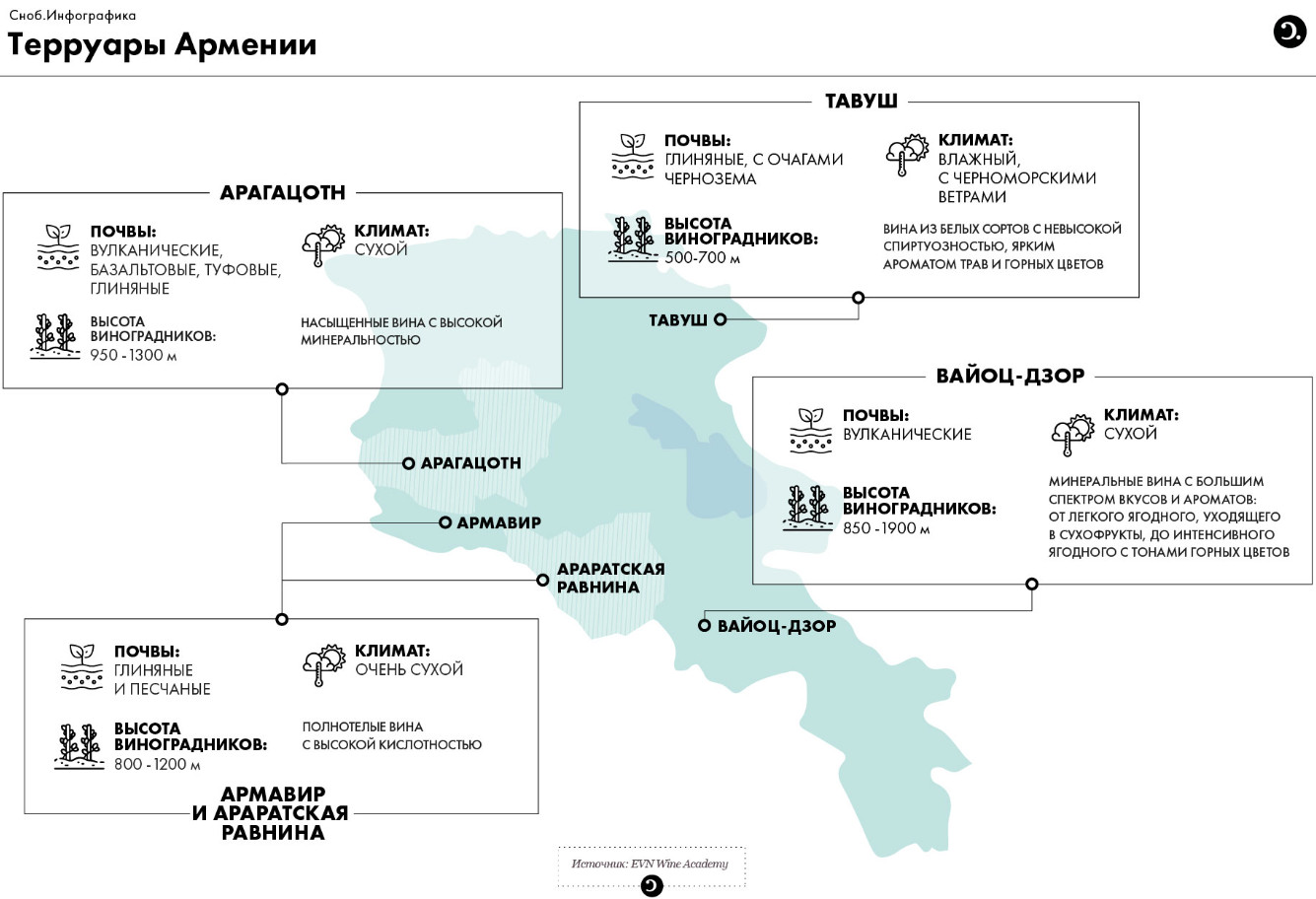 Разнообразию армянских вин способствуют сильные перепады высот, на которых расположены армянские виноградники. Если в северном регионе Тавуш виноград растет на высоте от 500 метров, то в юго-западном Вайоц-Дзоре находятся самые высокогорные виноградники в Северном полушарии, которые дают урожай на высоте 1900 метров. Это позволяет производить в Армении все типы вин, в отличие, например, от Германии, где невозможно получить мощные полнотелые вина с высоким градусом, или Андалусии, где крайне трудно достичь легкости, свойственной долине Рейна.