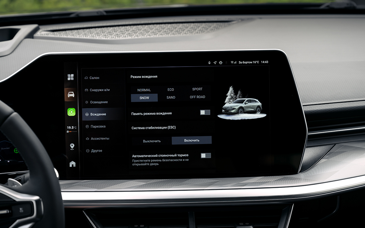 Знакомство с новым F7 лучше всего начинать изнутри. Мультимедийная система с огромным, ярким и контрастным дисплеем (12,3 или 14,6 дюйма в зависимости от комплектации) впечатляет не только картинкой, но и возможностями. В отличие от конкурентов, в Haval не стали дожидаться гневных отзывов покупателей и до старта продаж внедрили штатную навигацию, поддержку Apple CarPlay (Android Auto пока проходит сертификацию и появится в 2025 году) и даже голосовое управление. Интеграцию онлайн-сервисов доверили «Яндексу». Через Яндекс ID можно, в частности, синхронизировать плей-листы из «Яндекс Музыки» или сохранять избранные локации в навигаторе.