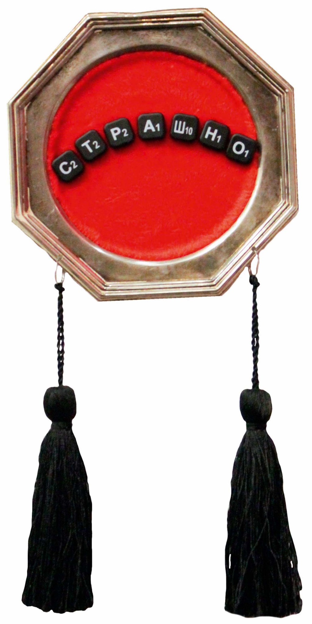Художница складывает свои парадоксальные мемобъекты из фишек игры «скрэббл» или «эрудит» и найденных на барахолках деталей — кисточек от штор, леопардового меха и хрустальных бусинок.