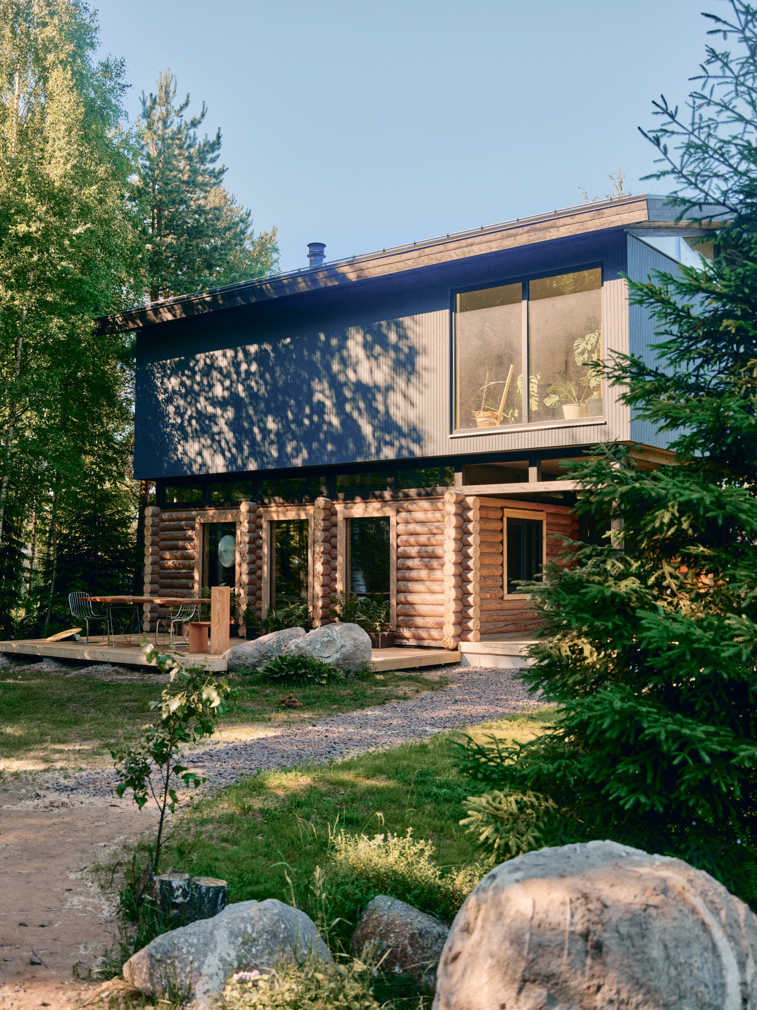 Экстерьер: валуны, сруб и световые окна