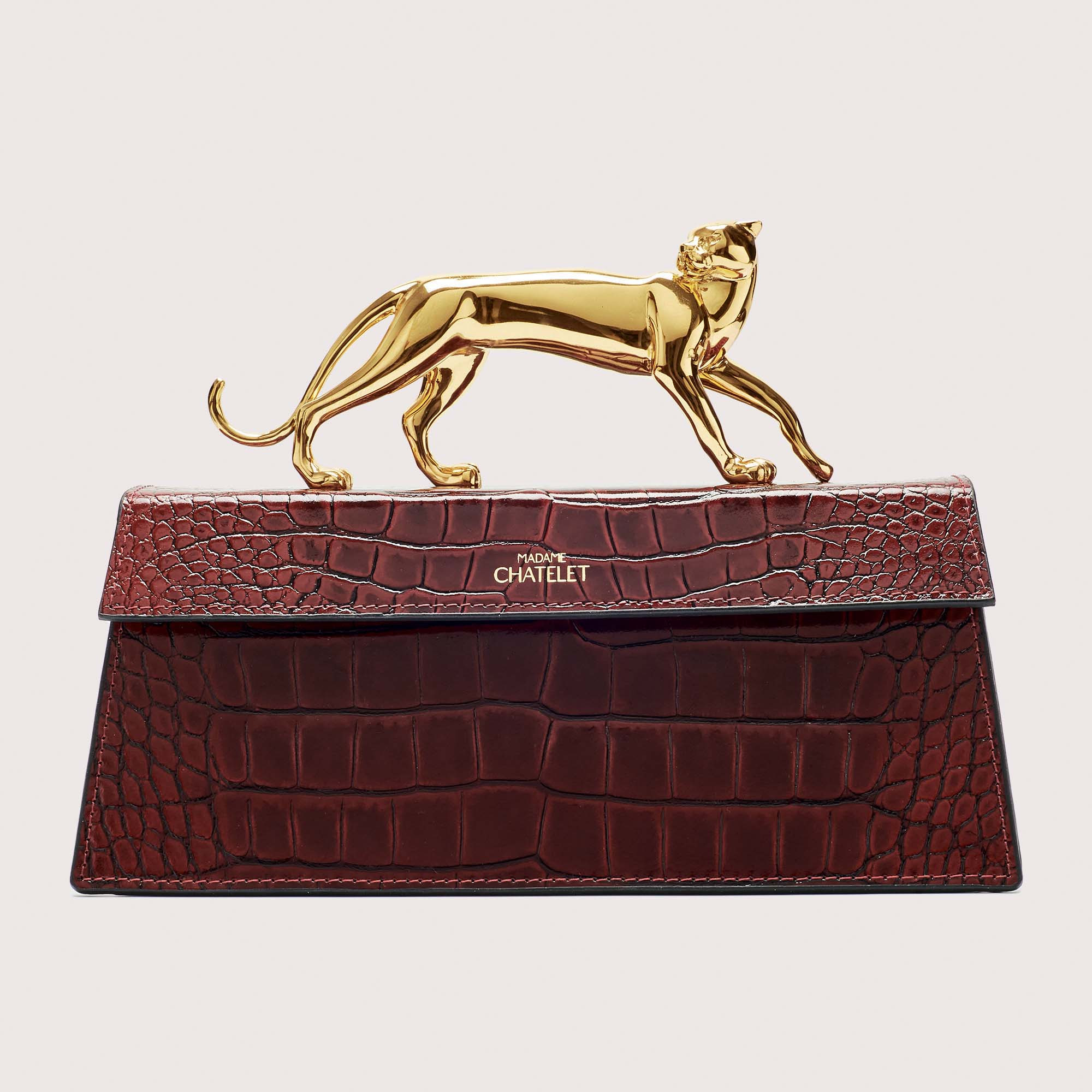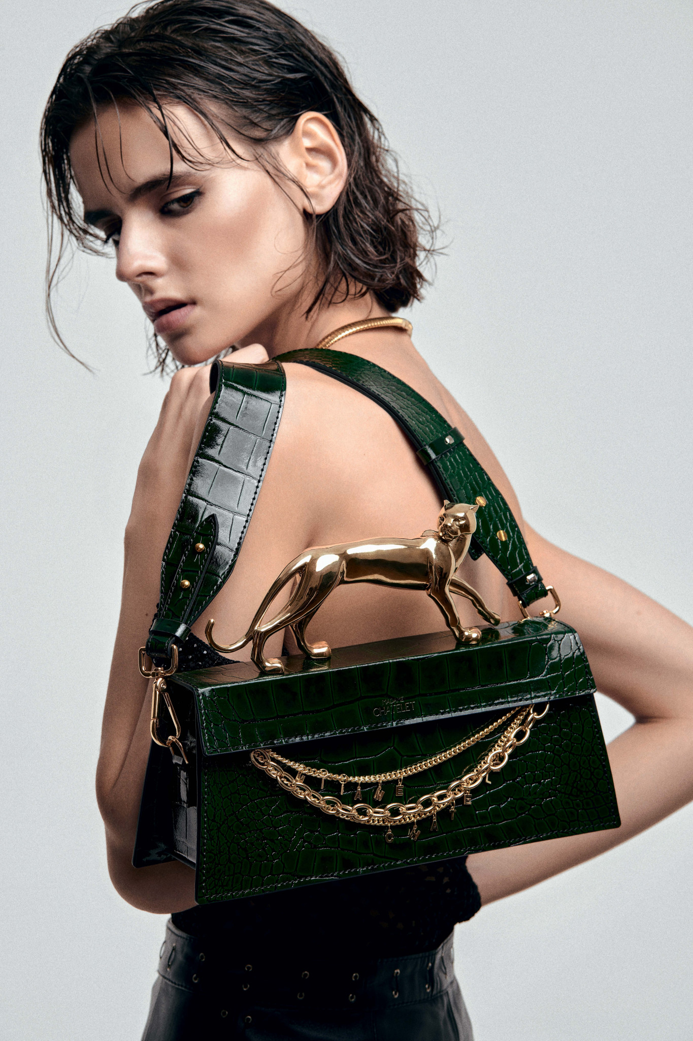 Сумка‑тотем из лакированной кожи с тиснением под крокодила с позолоченной ручкой-пантерой — едва ли не самый узнаваемый аксессуар отечественного производства. С Fatal от Madame Chatelet ходят Наталья Водянова, Алеся Кафельникова и Ксения Собчак. Вещи с актуальным флером нулевых изготавливаются полностью вручную в Москве, там же льют пантер, остальную фурнитуру используют итальянскую. Сумка появилась осенью 2021 года (на разработку ушло три месяца), а сейчас ее можно получить только по предзаказу (время ожидания — от двух недель). Бренд запустили три лучших друга: креативный директор Вячеслав Хрюков, дизайнер Максим Киревичев и директор по маркетингу Грета Джанбарянц. Название Madame Chatelet они придумали, отталкиваясь от того, что мадам — их клиент, а Шатле — станция метро в самом сердце Парижа.