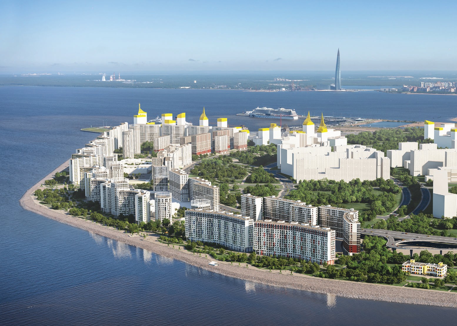 Дом и парк. И за архитектуру ЖК «Морская набережная», и за концепцию набережной отвечает бюро «Студия 44» Никиты Явейна, автора проекта реконструкции Главного штаба Государственного Эрмитажа. Первая линия домов разной высотности (от одиннадцати до двадцати двух этажей) улыбается и машет идущим по заливу пассажирским лайнерам. Фасады повторяют изгибы волны за счет чередования оконных проемов, эркеров, французских балконов и остекления в пол. По предложению «Студии 44» — именно их проект этого общественного пространства у залива победил на городском конкурсе «Парковая линия» — одиннадцать гектаров побережья будут зонированы анфиладами домов «Морской набережной» и превратятся в серию тематических парков. Так, в углублении фасадов обустроят зоны отдыха с разными функциями: обещают площадку для людей с ограниченными возможностями, шахматный двор, детский городок, баскетбольные и волейбольные площадки, велодорожку, места для игр и прогулок с животными.