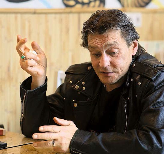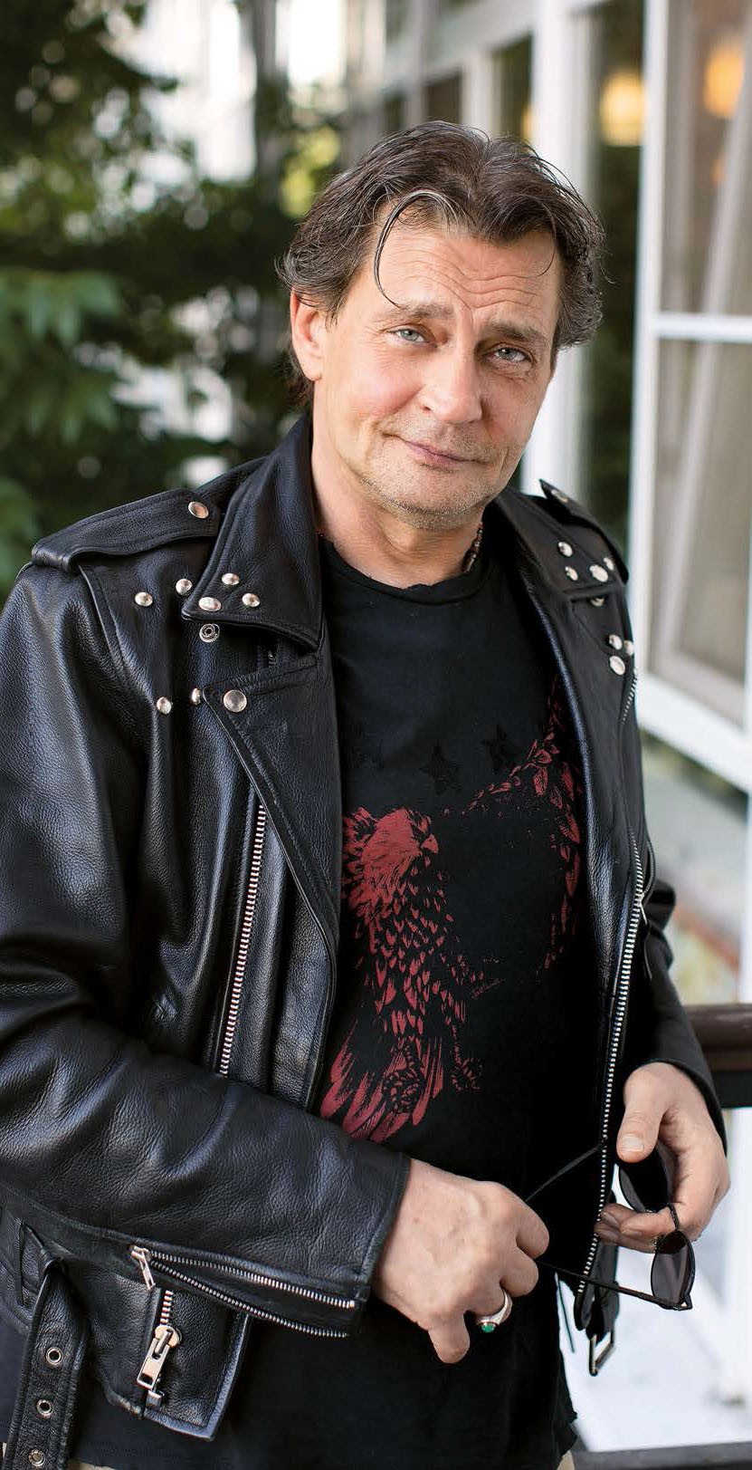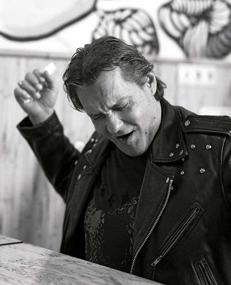 Рокерская косуха, джинсы клеш, шипованные кеды. И фирменный взгляд исподлобья. С народным артистом России мы встретились в неприметном японском ресторанчике накануне его 56-го дня рождения. Поинтересовалась: «Любите местную кухню?» Но оказалось, главный плюс места – прямо из кафе, поднявшись на шестой этаж бизнес-центра, можно попасть на базу, где уже пять лет репетирует музыкальная группа Домогарова. Руководитель он нестрогий: хоть и угрожал оштрафовать басиста за опоздание, видно по улыбке, что только в шутку.