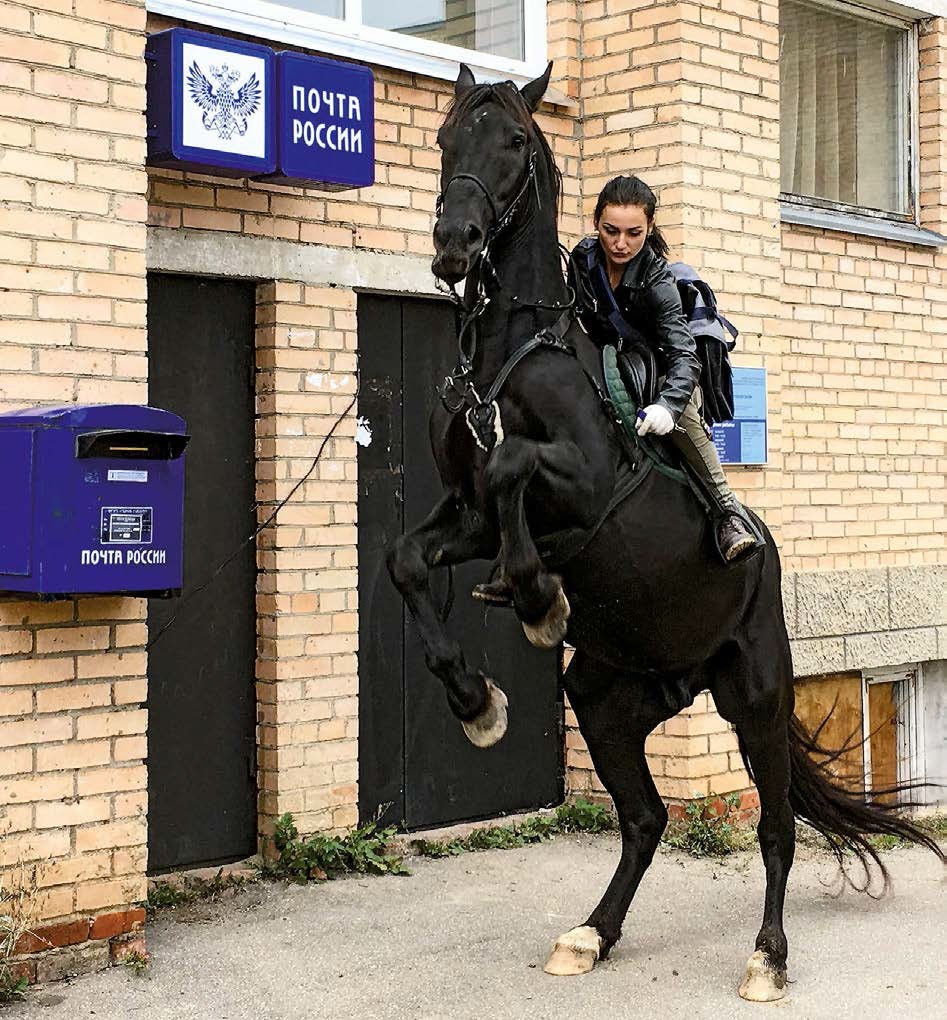 Жители подмосковной деревни Опарино и округи давно привыкли, что письма и газеты им доставляет наездница. 24-летняя Мария Рубцова долгое время жила в столице, но, устав от шума мегаполиса, решила переехать. С ней на новое место отправился и верный друг – вороной красавец Космос, подарок родителей (Маша с детства занималась конным спортом).