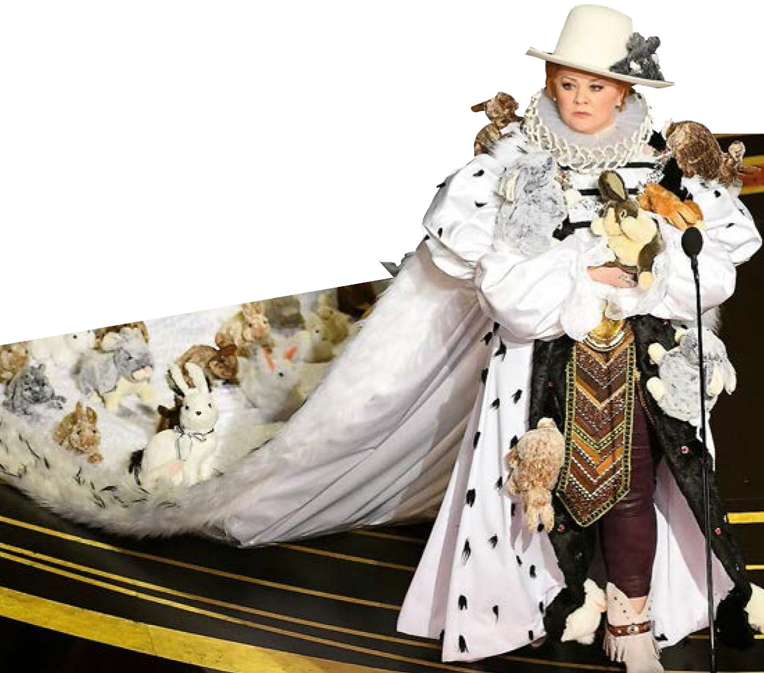 С юмором у организаторов «Оскара» точно порядок. Объявлять победителей в номинации «Лучший дизайн костюмов » актриса Мелисса Маккарти вышла в наряде, усыпанном мягкими игрушками – кроликами. Предполагаем, что стилист вдохновился злой королевой из «Алисы в Стране чудес».