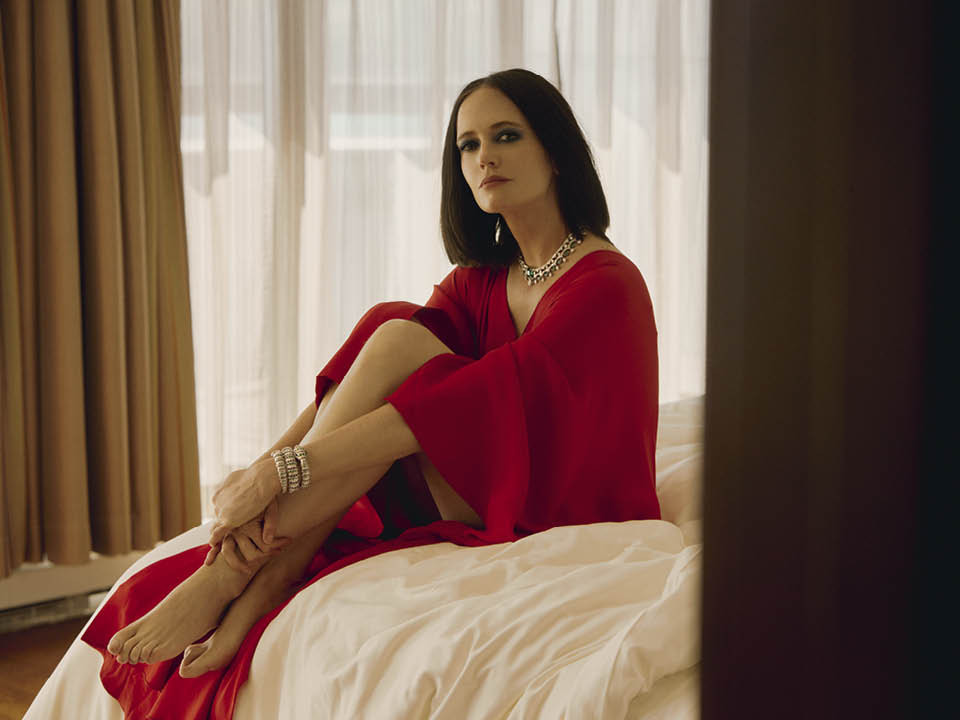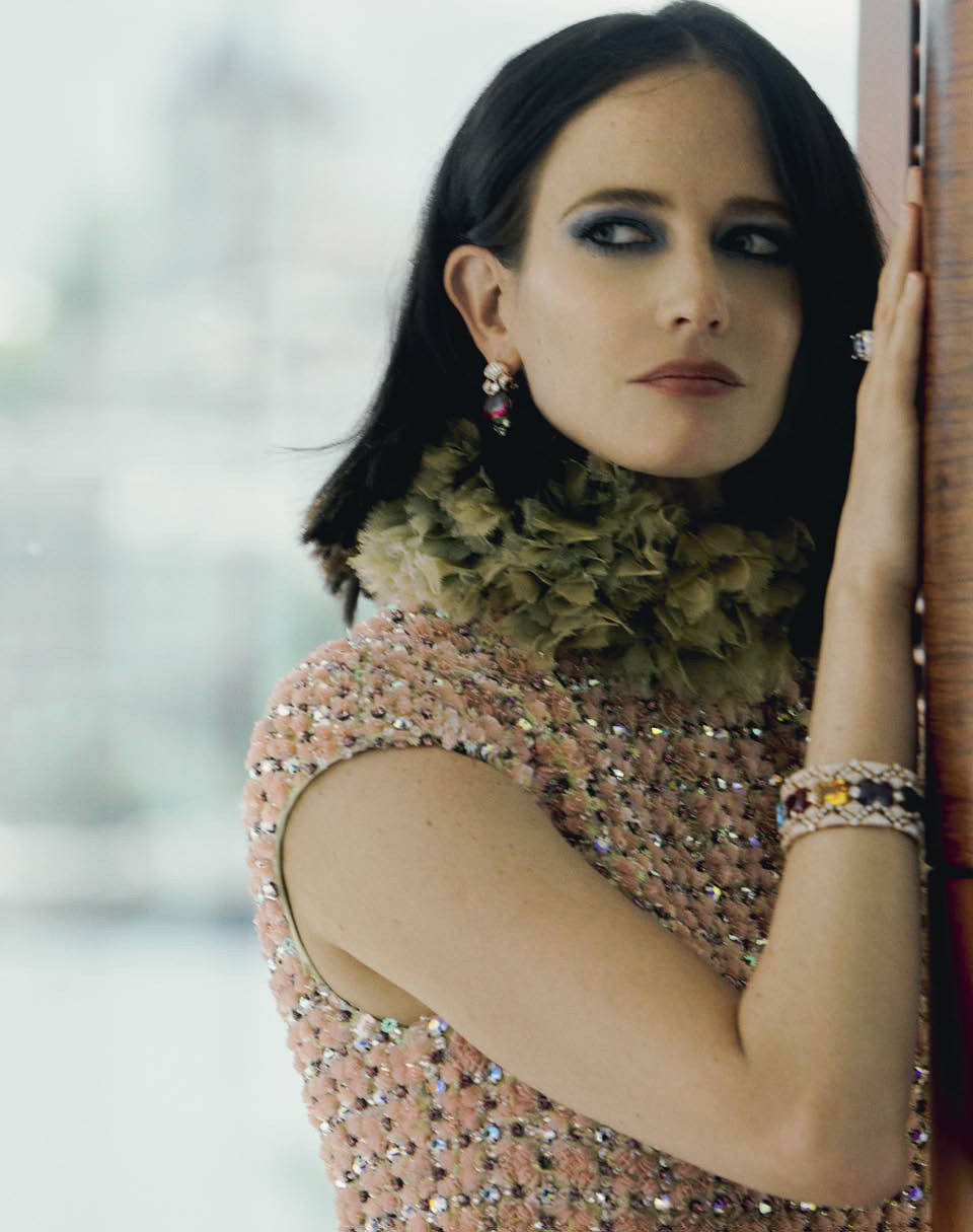 Актриса Ева Грин в отеле Fairmont Grand Hotel Geneva. Шелковое платье, Valentino; платиновое колье Emerald Ribbon с изумрудами и бриллиантами, браслет Serpenti с потайным циферблатом из белого золота с изумрудами, аметистами, лазуритом и бриллиантами, все Bvlgari High Jewellery.