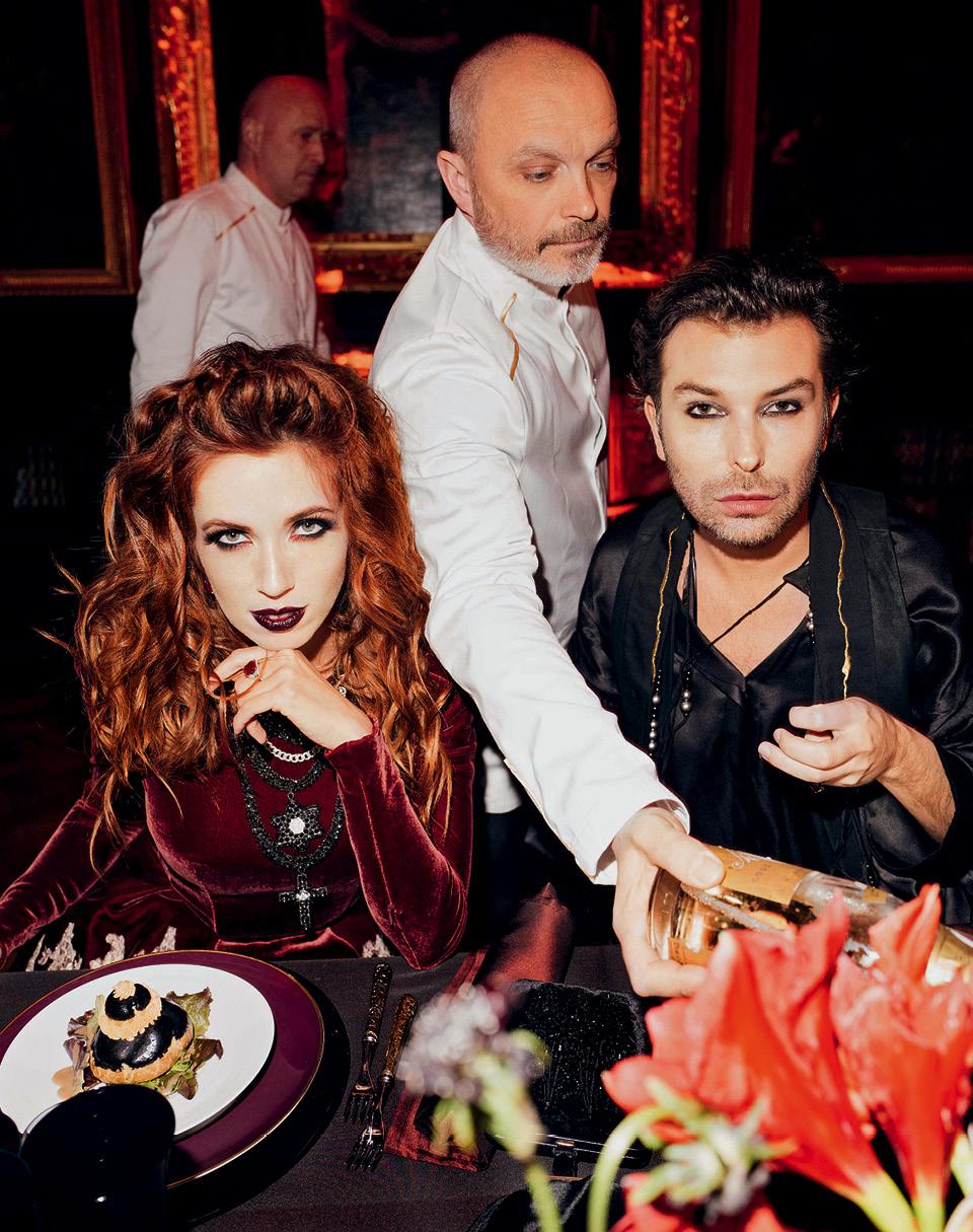 Выбор места был обусловлен чувством прекрасного бизнесмена Игоря Сосина — праздник в стилe «вампирская романтика» стал для его жены Инны полным сюрпризом. И главным подарком. Организацию вампиризма в сорока километрах от Парижа, в замке, где на стенах висят Боттичелли и Пуссен, основатель «Старика Хоттабыча» поручил близкому другу именинницы, знатоку французского art de vivre Денису Куделину. Мольер в Шантийи давал премьеру своей комедии «Cмешные жеманницы» — решено было не отступать далеко от традиций галантного века: выезд с факелами в запряженных гнедыми экипажах, коктейль в галерее и ужин в черно-красных тонах. Два Рафаэля на локации уже были, вампирскую пищу прислал гастроном Dalloyau. Рыжая Инна в бархате (это платье Ulyana Sergeenko Couture — одно из тех красных платьев, которые на аукционе amfAR для нее несколько лет назад приобрел любимый муж) склонилась над тортом, увенчанным очень реалистичным человеческим сердцем. Афтепати продолжалась до рассвета — вместо