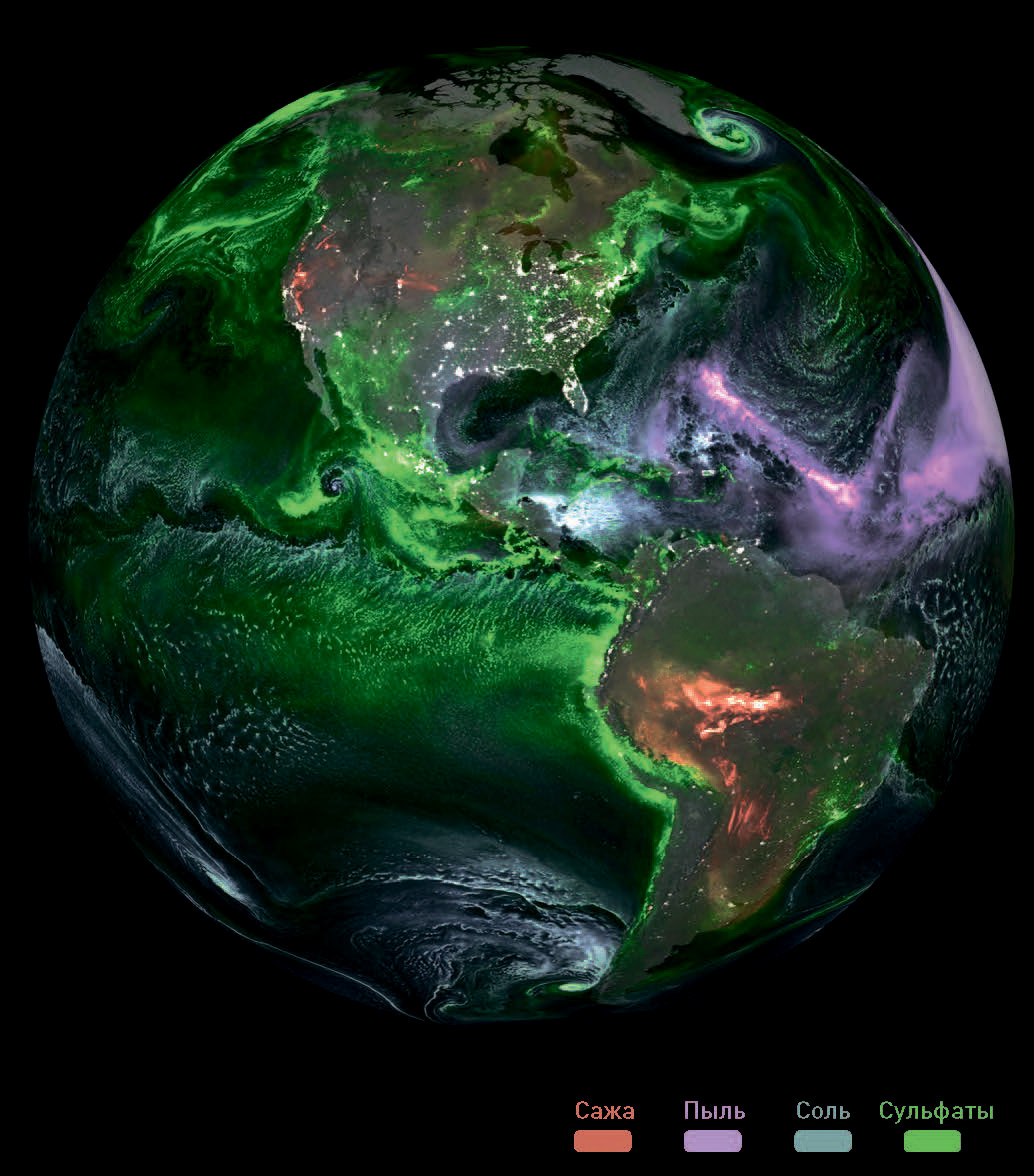 Воздух полон крошечных частиц природного и искусственного происхождения. Ветром они переносятся на огромные расстояния и оказывают большое влияние на погоду, климат и наше здоровье. Оценить эти невидимые глазу потоки можно на новом веб-сайте, который визуализирует данные мониторинга атмосферных аэрозолей, собранные проектом NASA Goddard Earth Observing System. Показанные зеленым сульфаты отражают интенсивность использования ископаемого топлива, прежде всего угля, а также активность вулканов. Фиолетовая пыль переносится через Атлантику из Сахары, смешиваясь с частицами морской соли (голубой цвет). Уголь (красный) связан со сжиганием растительной биомассы.