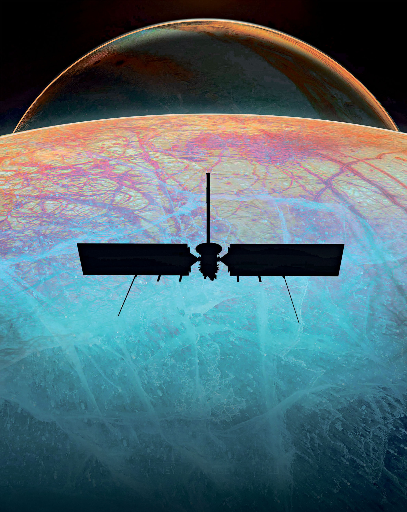 В процессе вращения спутника в мощном гравитационном поле Юпитера разные его участки испытывают разное притяжение. Возникают приливные силы, которые слегка деформируют, «мнут» его, словно большой кусок пластилина. Это приводит к появлению трещин и разломов в ледяной коре и вызывает разогрев, что позволяет прячущемуся под ней океану оставаться жидким. Время от времени внутреннее море прорывается наружу – гейзерами почти чистого водного пара с крайне небольшим количеством солей и, возможно, легких органических веществ. Если текущие оценки размеров этого океана близки к реальности, то он может содержать вдвое больше воды, чем наша собственная планета, которую принято считать голубой.