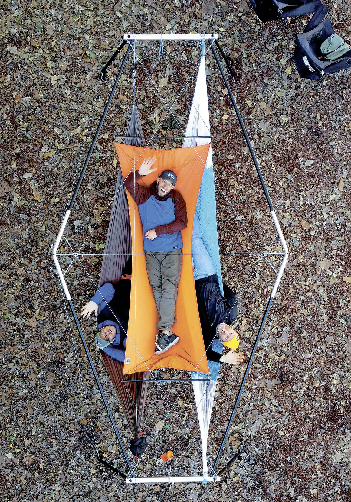 Гамак можно растянуть между любой подходящей парой опор, а если таких нет – на специальной стойке. Основатель стартапа YOBOgear Кол Фентон конструирует такие стойки с 2015 года, с каждой версией делая их все более компактными и легкими. Однако его новая модель Hive оказалась особенной: впервые стойка рассчитана сразу на три гамака. Весит она всего 6,8 кг и в собранном виде имеет размеры 81х15х15 см. На месте алюминиевая рама раскладывается и укрепляется растяжками, требуя (в зависимости от длины выдвижных ножек) 3,4 или 4,4 м. На таком пространстве легко размещаются два или три гамака вместе с их владельцами. Ажурная конструкция выдерживает даже довольно корпулентных отдыхающих: она рассчитана на общую нагрузку до 340 кг.