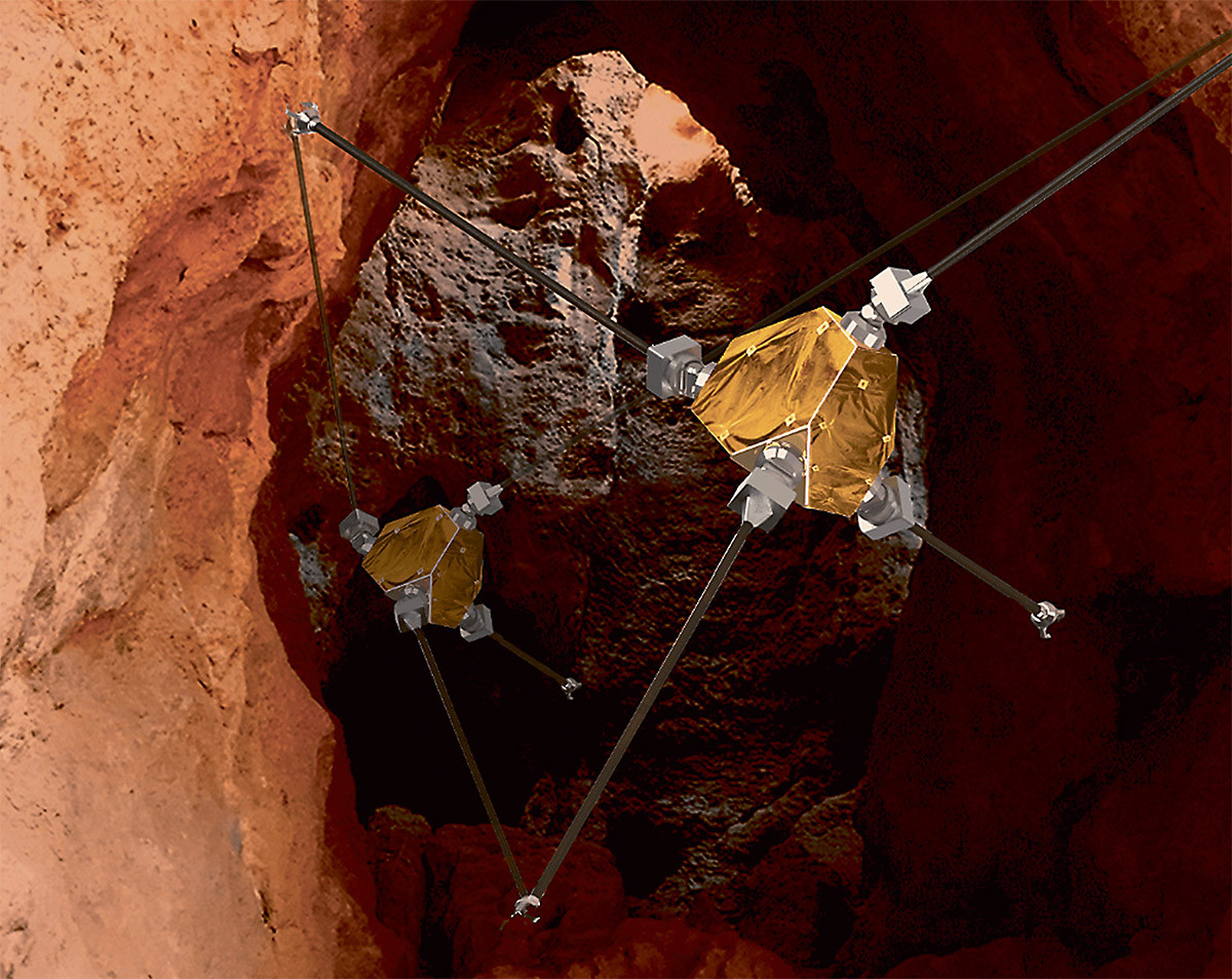 Поверхность Луны, Марса, а возможно, и ледяных спутников планет-гигантов скрывает множество глубоких пещер. В их вечной тьме могут найтись уникальные свидетельства прошлого этих небесных тел и даже следы внеземной жизни. Однако для работы в таких условиях требуются аппараты, совершенно непохожие на обычные зонды и марсоходы, неподвижные или колесные. Такой концепт представили недавно инженеры из Стэнфордского университета. ReachBot способен перемещаться по самому сложному и непредсказуемому ландшафту благодаря комплекту раздвижных конечностей, каждая из которых снабжена захватом со множеством металлических шипов. Закрепившись на нескольких «ногах», робот перемещает свободную конечность, находя новую точку опоры. Текущий проект фокусируется на изучении марсианских пещер. По оценкам разработчиков, чтобы действовать в них, ReachBot придется снабдить телескопическими «ногами», способными удлиняться до 20 м, а также камерами и лидаром для навигации.
