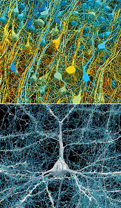 Ученые из Гарвардского университета в коллаборации с Google создали полноценную цифровую модель одного кубического миллиметра человеческого мозга. Они сумели воспроизвести систему из 57 тыс. отдельных нейронов и 150 млн синапсов, контактов между ними, плюс 230 мм капилляров, которые снабжают клетки кровью. Вся эта информация занимает порядка 1400 Тб и получена на основе электронных микрофотографий срезов мозга реального пациента, скончавшегося от эпилепсии. Созданные в Google алгоритмы позволяют работать с моделью, выделяя нужные участки и рассматривая их в мельчайших деталях. Исследования уже помогли обнаружить один весьма любопытный паттерн, который объединяет с полсотни синапсов и влияет на активность огромного числа нейронов. Возможно, он как-то связан с эпилептическими приступами, и его открытие поможет найти эффективные способы их лечения.