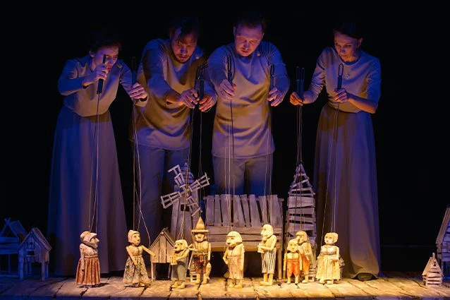«Тревожно, тревожно», — вздыхает деревянная кукла. В зале темно, и только на сцене сияет огонек, желтый, словно от свечи. Вдалеке слышится волчий вой, и становится так невыносимо тоскливо, что хочется, как в детстве, забраться с ногами на кровать и спрятаться с головой под плед. «Стоп! Это все-таки колыбельная. Говорить нужно спокойнее, убаюкивающее», — объясняет главный режиссер театра Геннадий Шугуров одетым в серое актерам-кукловодам.