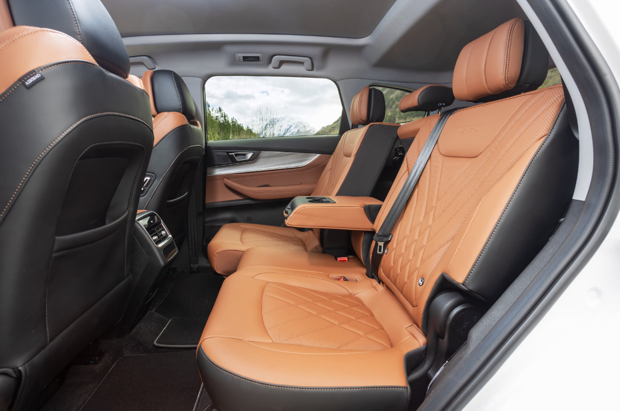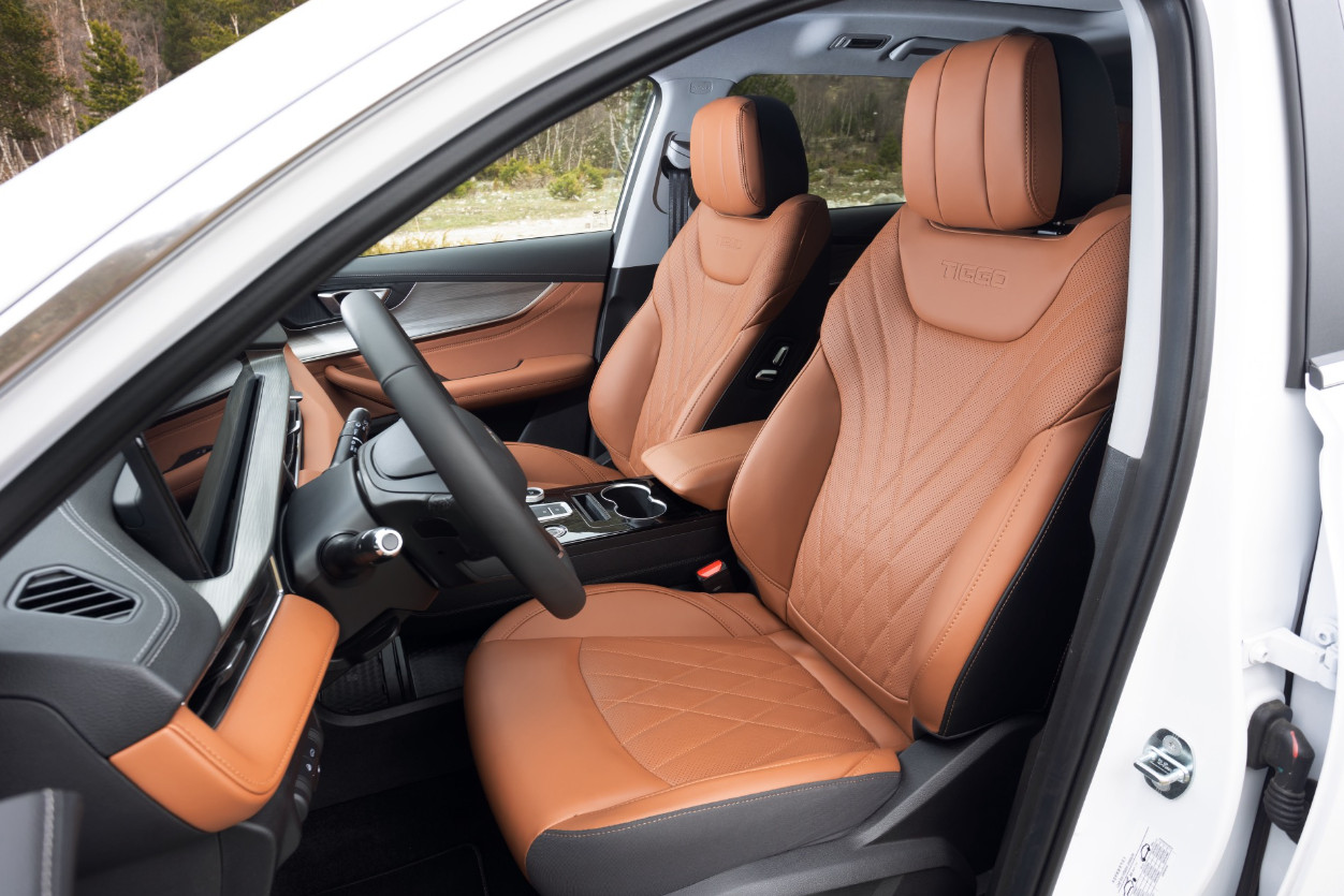 По виду не скажешь, что это топ-модель. В сравнении с максимально оснащенным бензиновым Tiggo 8 Pro Max здесь нет никаких броских признаков. Главная внешняя особенность — дополнительный лючок для подзарядки переменным током через европейский разъем Type 2. Этот тип разъема предусматривает только один вариант зарядки — соответственно, быстрая зарядка не предусмотрена. А под кузовом выдается корпус аккумуляторного блока, из-за чего клиренс уменьшился на сантиметр — до 180 мм.