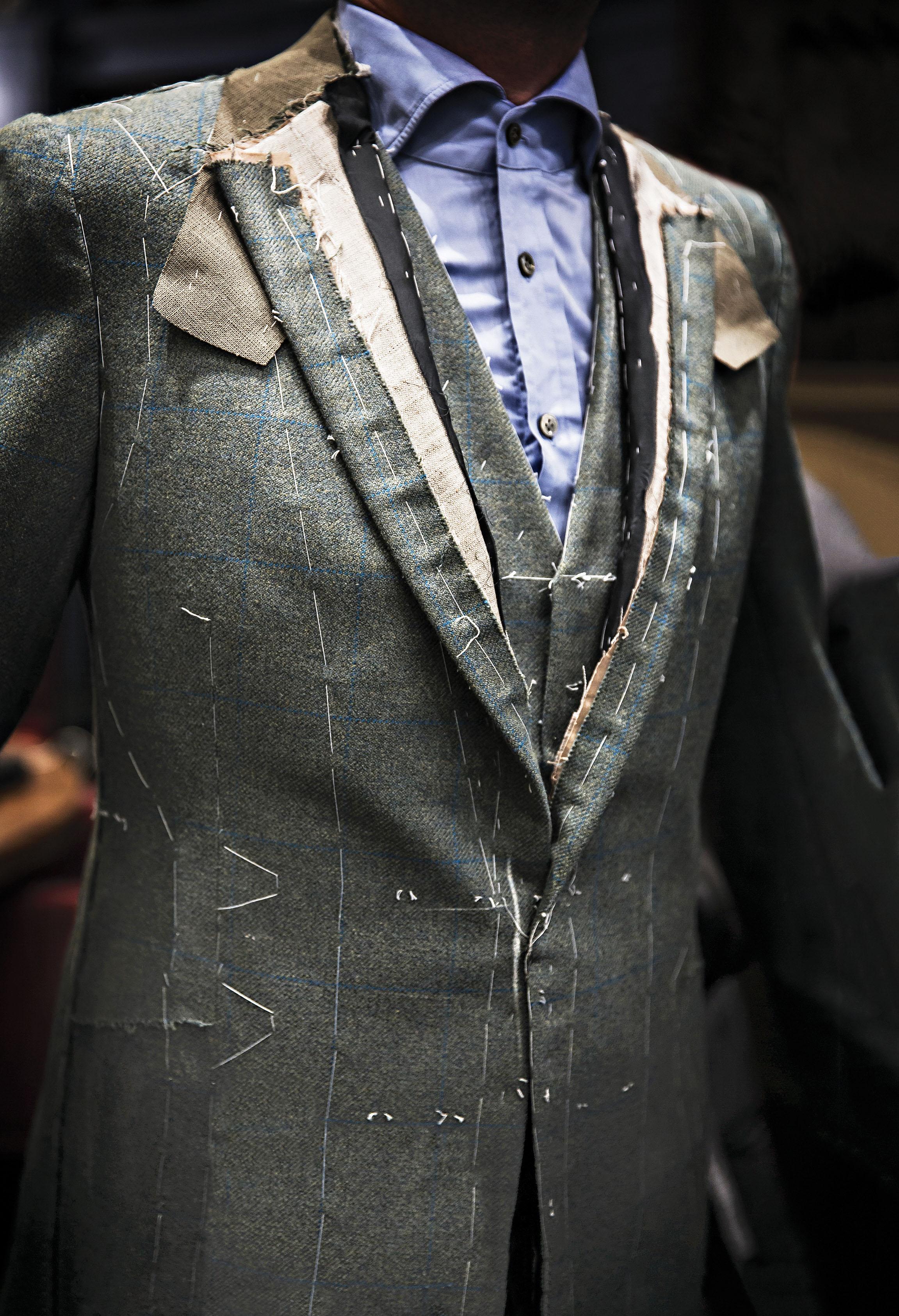 Самый распространенный вариант бортовки делают из смеси конского волоса, шерсти и льна. В этом случае волос нарезан мелко, чтобы мягко держать форму, и вплетен в тканевую основу. При ношении пиджака бортовка со временем «подстраивается» под контуры тела, благодаря чему посадка становится точнее. Именно с помощью жесткости бортовки создается объемный перегиб лацкана. В bespoke-пошиве портной придерживает лацкан одной рукой, отгибая его в нужном направлении, а другой прокладывает невидимые с основной стороны мелкие стежки, захватывая шерсть буквально за одну нить. Так ткань «запоминает» направление перегиба. У каждого портновского дома есть своя традиция конструкции бортовки. На весь мир известны «свободный покрой» (drape cut) Anderson & Sheppard или «неаполитанский силуэт» Cesare Attolini, но портные редко раскрывают технологические детали их исполнения. Мне же удалось побеседовать с мастерами и разузнать некоторые подробности.