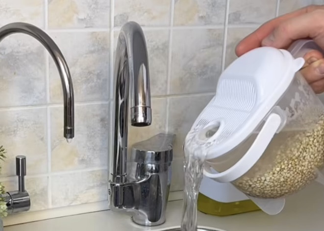 Иногда рис бывает сложно промыть даже за несколько подходов, а после третьего раза половина крупинок уже оказывается в раковине. Чтобы упростить вам задачу и сохранить продукт, был придуман специальный дуршлаг для мытья круп. В контейнере есть специальный отсек для заливания воды и мелкое ситечко, которое не позволит рису «выбраться» из емкости.