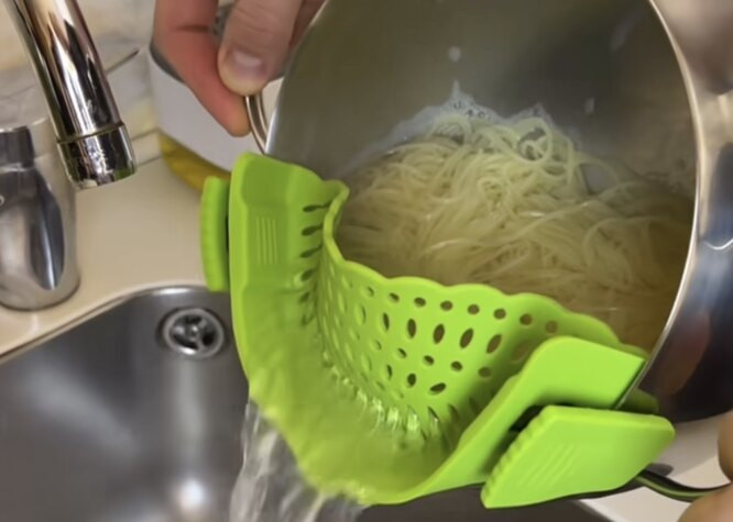 Если вам надоело каждый раз при готовке макарон мучаться с обычным дуршлагом, советуем присмотреться к этому варианту. Силиконовое приспособление крепится прямо к краю кастрюли, не соскальзывает и не дает пару обжечь ваши руки.