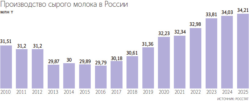 Производство сырого молока в России в 2025 г. достигло максимума за 30 лет и составило 34,3 млн т, сообщил вице-премьер РФ Дмитрий Патрушев. Такие данные он привел на XVII съезде Национального союза производителей молока (Союзмолоко) в конце января. По сравнению с показателем 2024 г. производство выросло примерно на 1%.