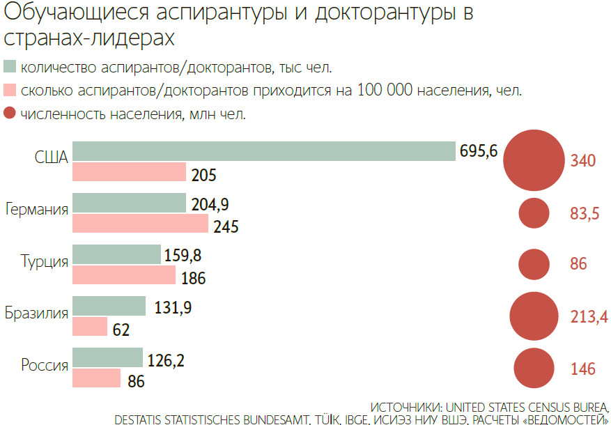 В США, которые занимают первое место в рейтинге (по количеству докторантов в стране), на 100 000 населения приходится их 205. А в Германии, занявшей второе место, – 245 обучающихся. Тройку лидеров по количеству аспирантов замкнула Турция. В ней, как подсчитали «Ведомости», на 100 000 населения приходится 186 докторантов. На четвертом месте оказалась Бразилия, в которой 62 таких обучающихся на 100 000 человек.