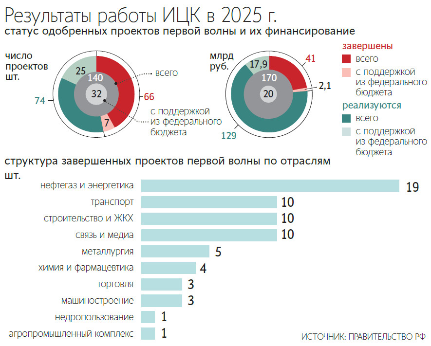 Всего в первую волну было отобрано 140 проектов на 170 млрд руб., говорилось в презентации Мишустина на ЦИПР-2025. К июню 2025 г. ИЦК реализовали 66 проектов на 41 млрд руб., сообщал премьер на форуме ЦИПР. Оставшиеся проекты реализуются в текущий момент и будут завершены до конца 2026 г., пояснил представитель аппарата Григоренко. Во вторую волну проектов ИЦК было отобрано 49 новых особо значимых IT-проектов, сообщало правительство в конце мая 2025 г. Работа над оставшейся частью проектов первой волны и над проектами второй волны будет идти параллельно, уточнил собеседник. Более 85% проектов второй волны будет завершено до конца 2027 г. Общий объем реализации решений и услуг в сфере IT в России составил 4,5 трлн руб. в 2021–2024 гг., рассказывал Мишустин.
