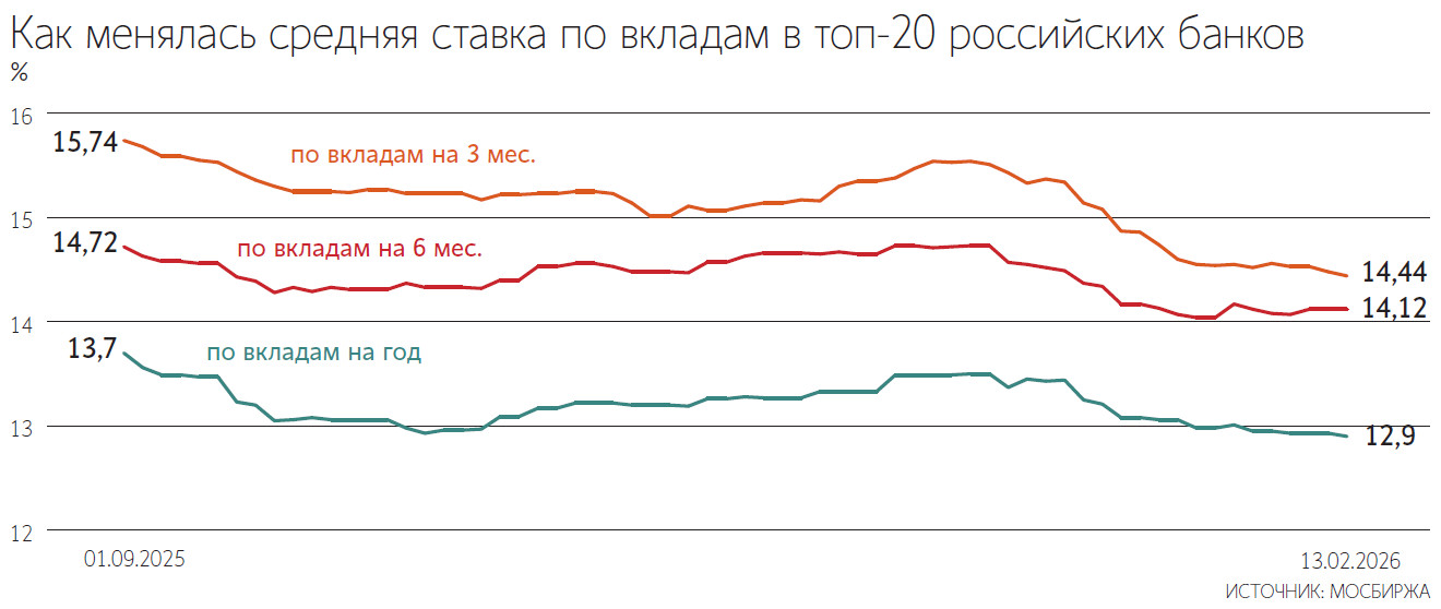 Накануне заседания Банка России средняя ставка по вкладу на один год в топ-20 банков упала до 12,9% (-0,03 п. п. с начала недели), средняя ставка по депозиту на три месяца – до 14,44% (-0,09 п. п.), следует из данных индекса вкладов «Финуслуг» на 13 февраля. По остальным вкладам средние ставки не изменились: средняя ставка по вкладу на шесть месяцев сохраняется на уровне 14,12% годовых, а по вкладам на срок от полутора до трех лет – в диапазоне 10,56–11,46%.
