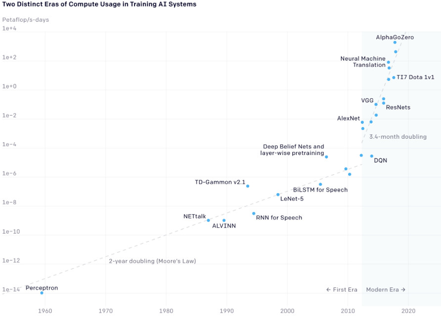 Спустя шесть лет исследователи из OpenAI проанализировали ключевые работы в области нейросетей и показали, что именно с AlexNet в 2012 году начался рост затрачиваемой на обучение вычислительной мощности. Если раньше она удваивалась каждые два года, следуя закону Мура, то с 2012 года удвоение происходило уже каждые 3–4 месяца. Благодаря такой четкой временной границе OpenAI предложила называть период после 2012 года «современной эрой».