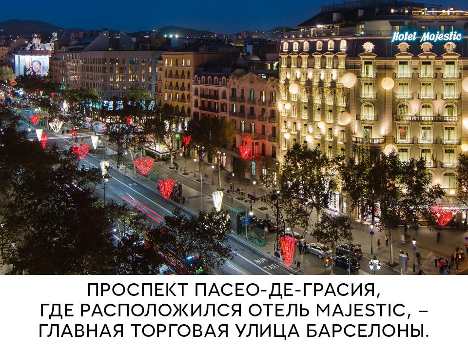 Выбирая гостиницу, первым делом ответьте на вопрос: классика или модерн? Поселиться в стеклянной башне над морем и любоваться круговой панорамой на город и море с высоты птичьего полета? Или избрать своим форпостом историческое здание ар-нуво в окружении бутиков Chanel, Louis Vuitton, Dolce & Gabbana и шедевров Антонио Гауди? Мы выбрали второй вариант — старинный отель Majestic на Пасео-де-Грасия, здешних Елисейских Полях. Благодаря недавней реставрации отель можно назвать одним из лучших в городе. С балкона открывается вид на «квартал раздора»: так называют пятачок, где сосредоточились стилистически разнородные, но гениальные, каждая в своем роде, постройки четырех барселонских архитекторов-модернистов: Гауди, Пуч-и-Кадафалька, Доменек-и-Монтанера и Энрике Сагниера.