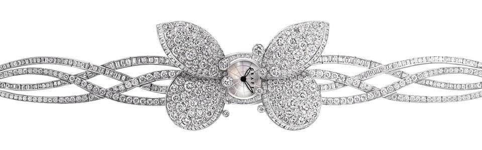 На ювелирной выставке в Базеле мастера Graff представили очередной шедевр — изящный браслет из белого золота с семью сотнями бриллиантов общим весом двадцать два карата. При нажатии на потайной рычаг крылья бабочки распахнутся и появятся часики с перламутровым циферблатом.