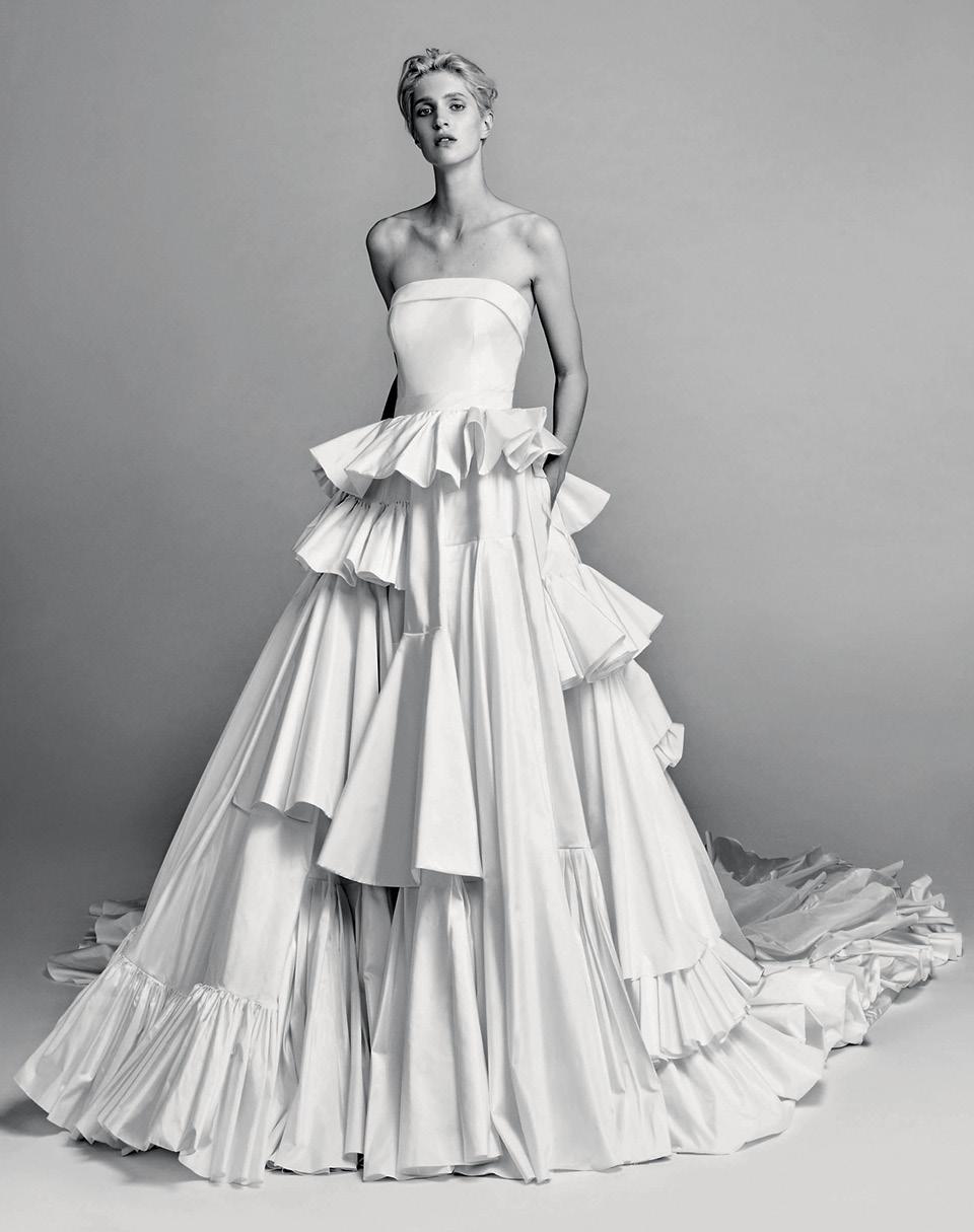 В своей второй свадебной коллекции голландский дуэт Viktor & Rolf предлагает подвенечные платья в их фирменном эксцентричном стиле: с многоярусными юбками, мини в духе 1960‑х, а также асимметричные комбинезоны с бантом.