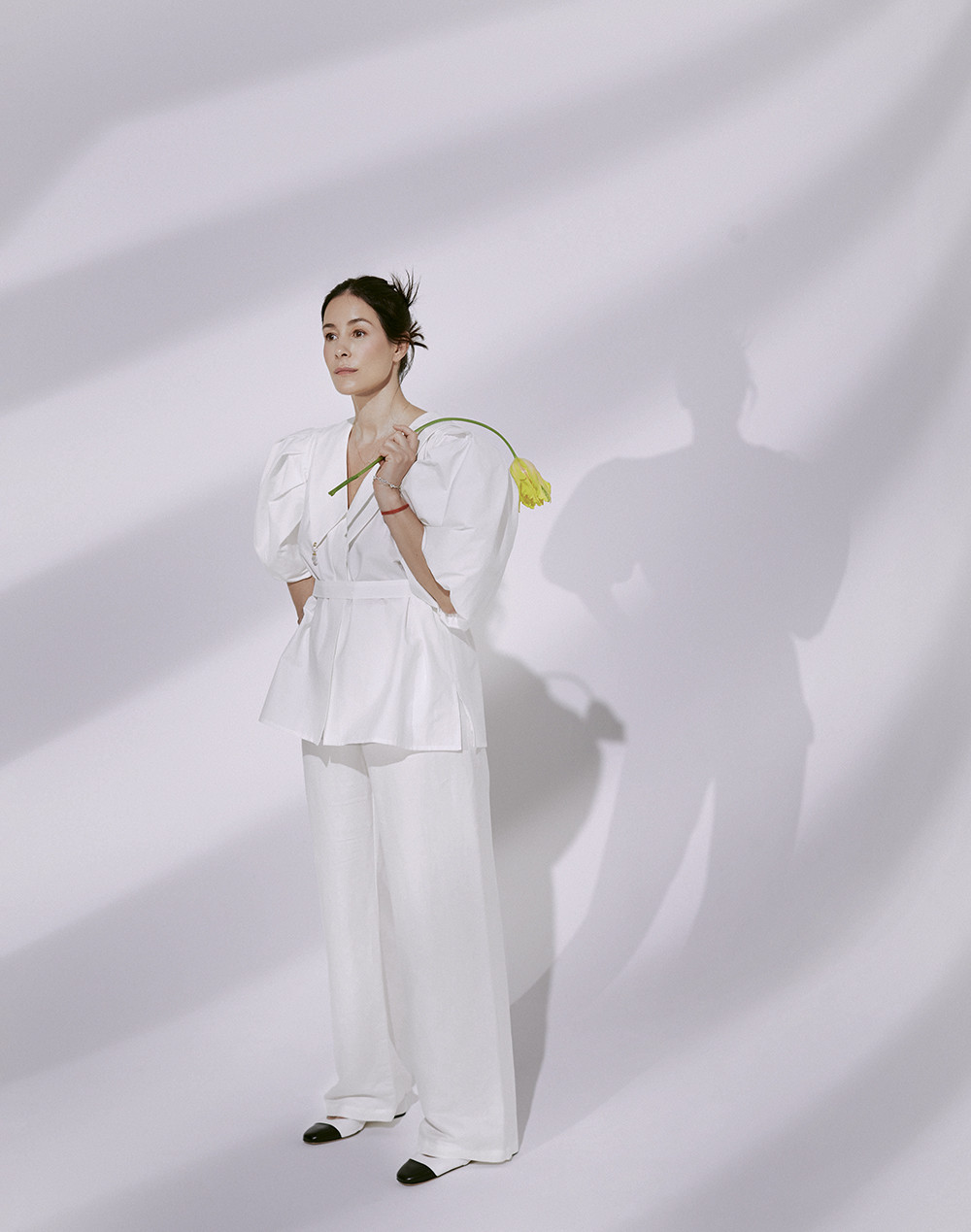 Даже в минималистичных декорациях фотостудии актриса придумала свою историю – и не просто позировала нам, а сыграла настоящую драму (пусть из партнеров у нее и был только цветок). Обсудили с Ольгой, почему она не хочет власти на площадке и как открыла в себе терпимость.